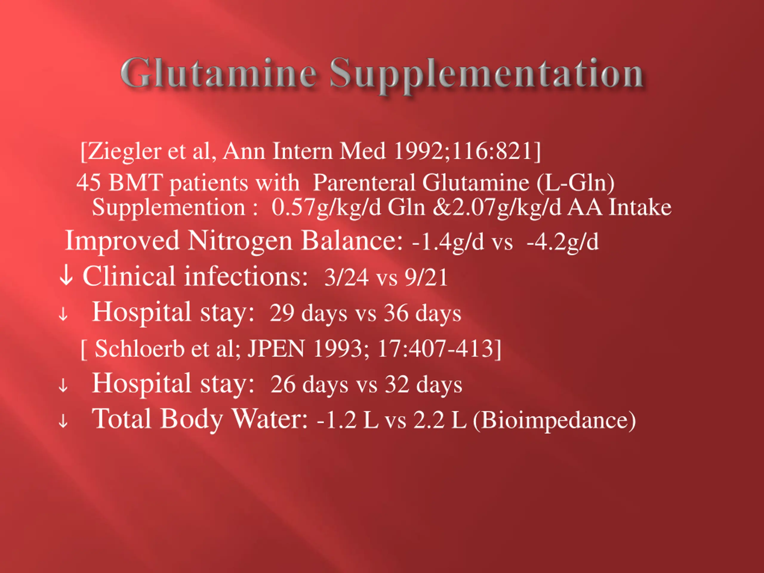 [Ziegler et al, Ann Intern Med 1992;116:821] 45 BMT patients with Parenteral Glutamine (L-Gln) Supplemention : 0.57g/kg/d Gln &2.07g/kg/d AA Intake Improved Nitrogen Balance: -1.4g/d vs -4.2g/d Clinical infections: 3/24 vs 9/21 Hospital stay: 29 days vs 36 days [ Schloerb et al; JPEN 1993; 17:407-413] Hospital stay: 26 days vs 32 days Total Body Water: -1.2 L vs 2.2 L (Bioimpedance)