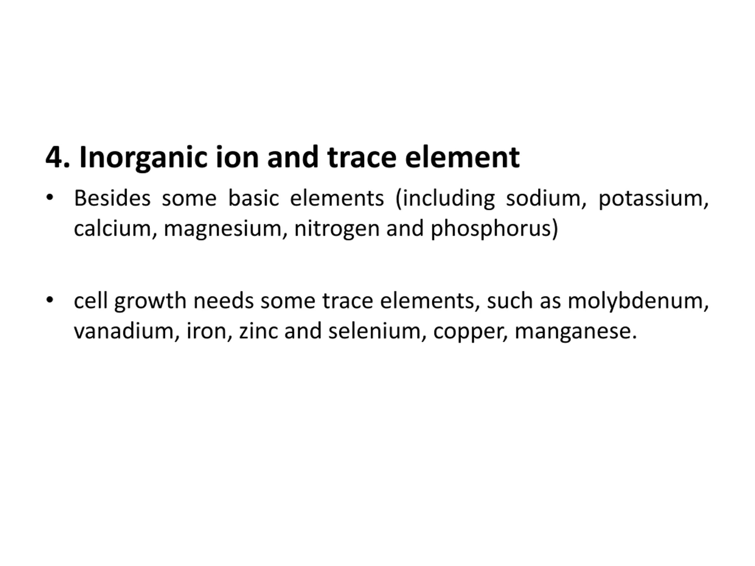 4. Inorganic ion and trace element Besides some basic elements (including sodium, potassium, calcium, magnesium, nitrogen and phosphorus) cell growth needs some trace elements, such as molybdenum, vanadium, iron, zinc and selenium, copper, manganese.