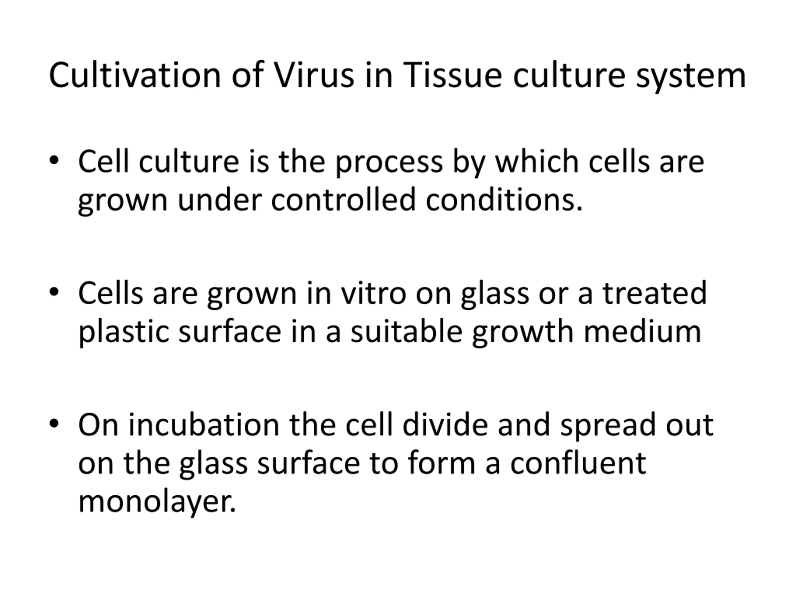 Cultivation of Virus in Tissue culture system Cell culture is the process by which cells are grown under controlled conditions. Cells are grown in vitro on glass or a treated plastic surface in a suitable growth medium On incubation the cell divide and spread out on the glass surface to form a confluent monolayer.