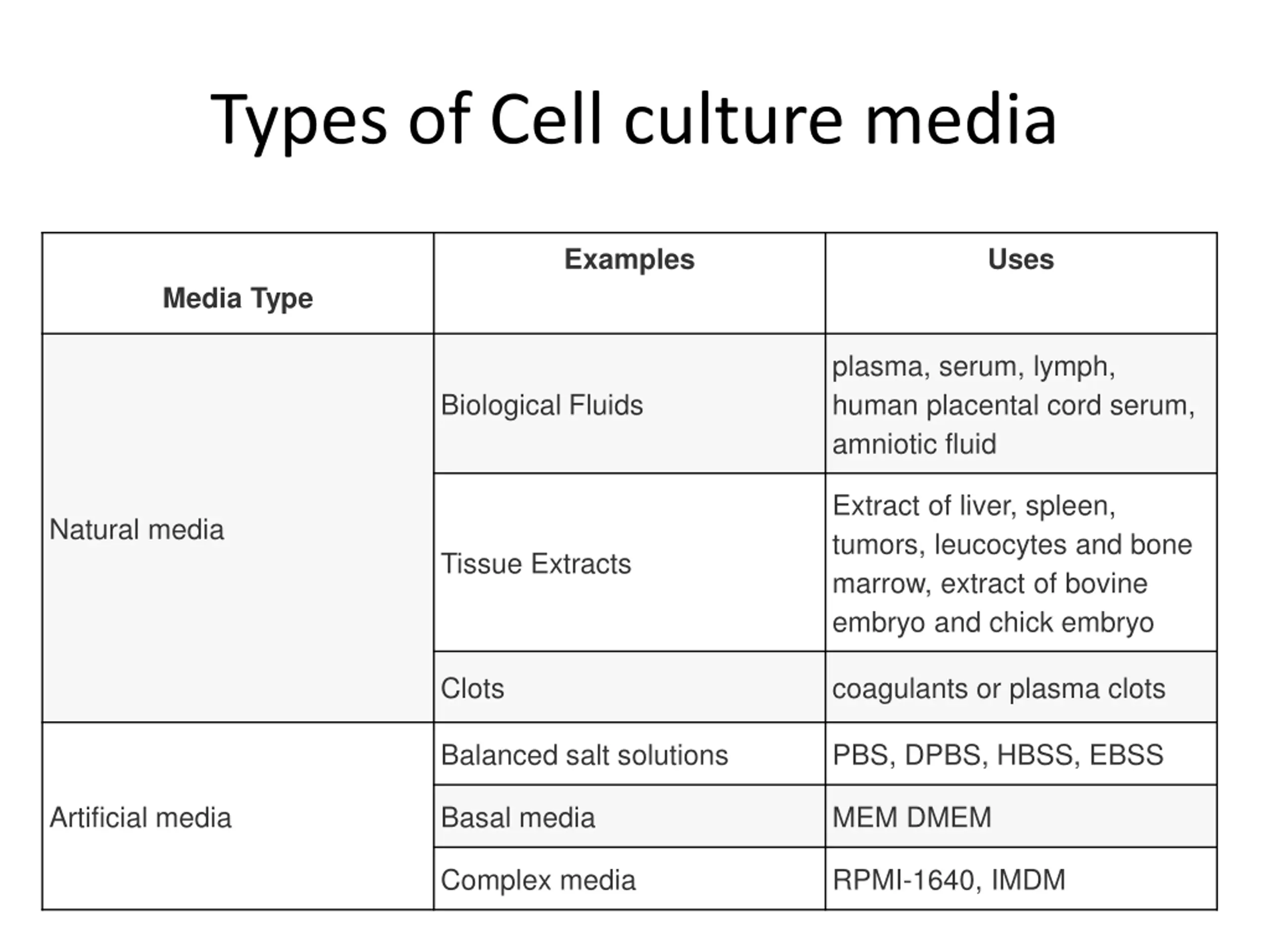 Types of Cell culture media Examples Uses Media Type plasma, serum, lymph, human placental cord serum, amniotic fluid Biological Fluids Extract of liver, spleen, tumors, leucocytes and bone marrow, extract of bovine embryo and chick embryo Natural media Tissue Extracts Clots coagulants or plasma clots Balanced salt solutions PBS, DPBS, HBSS, EBSS Artificial media Basal media MEM DMEM Complex media RPMI-1640, IMDM