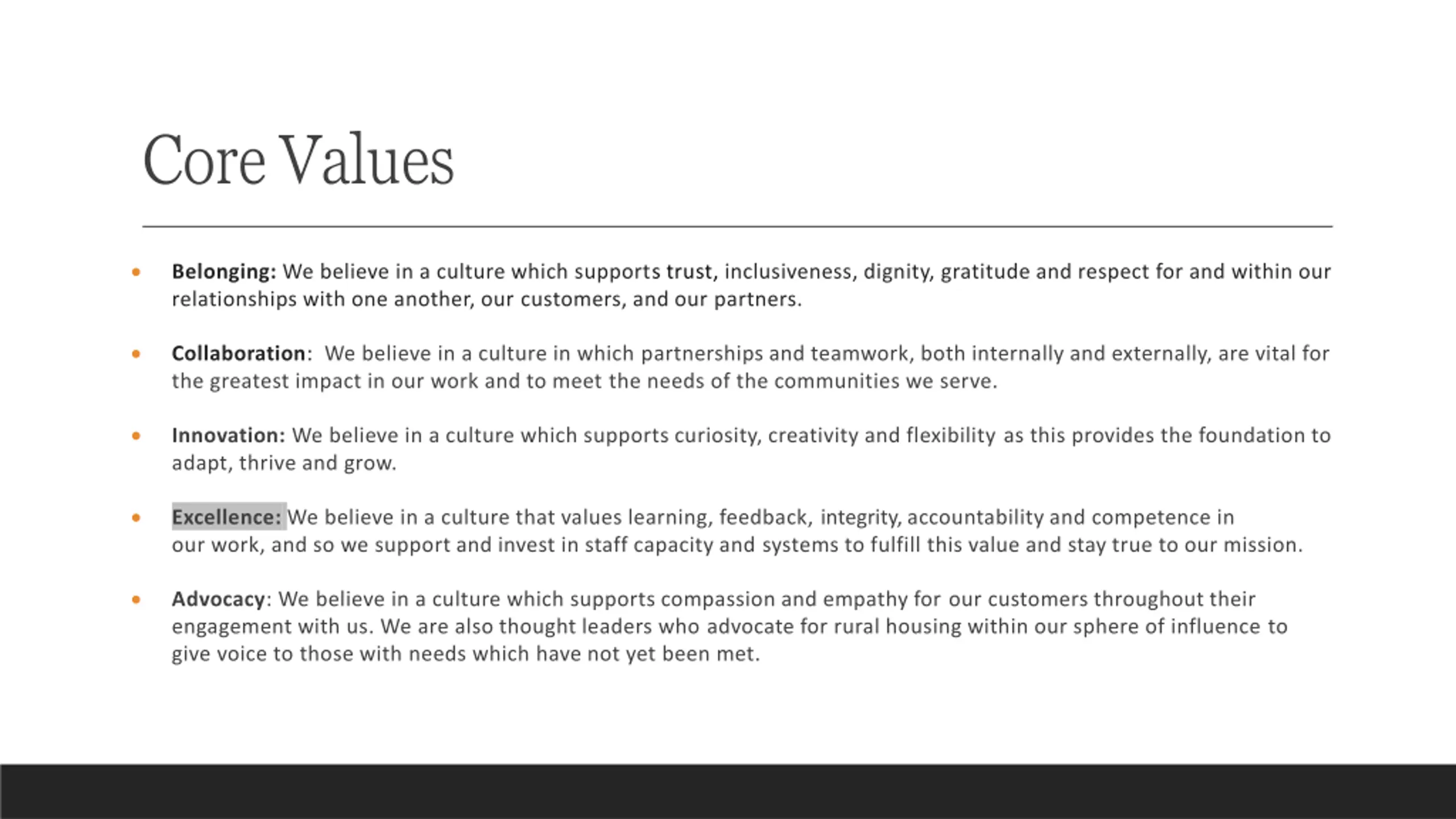 Core Values Belonging: We believe in a culture which supports trust, inclusiveness, dignity, gratitude and respect for and within our relationships with one another, our customers, and our partners. Collaboration: We believe in a culture in which partnerships and teamwork, both internally and externally, are vital for the greatest impact in our work and to meet the needs of the communities we serve. Innovation: We believe in a culture which supports curiosity, creativity and flexibility as this provides the foundation to adapt, thrive and grow. Excellence: We believe in a culture that values learning, feedback, integrity, accountability and competence in our work, and so we support and invest in staff capacity and systems to fulfill this value and stay true to our mission. Advocacy: We believe in a culture which supports compassion and empathy for our customers throughout their engagement with us. We are also thought leaders who advocate for rural housing within our sphere of influence to give voice to those with needs which have not yet been met.
