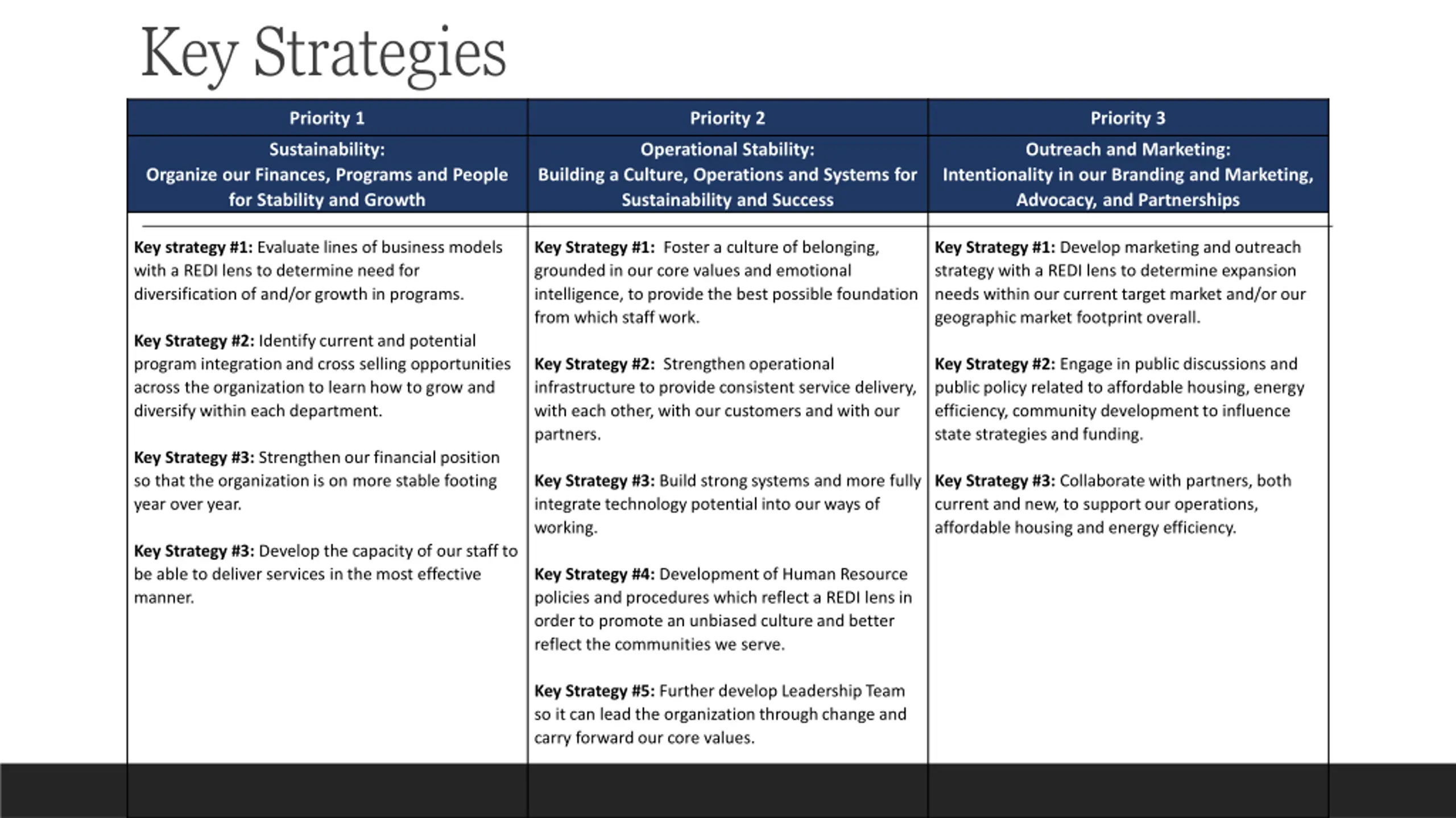 Key Strategies Priority 1 Priority 2 Priority 3 Sustainability: Operational Stability: Outreach and Marketing: Intentionality in our Branding and Marketing, Advocacy, and Partnerships Organize our Finances, Programs and People for Stability and Growth Building a Culture, Operations and Systems for Sustainability and Success Key strategy #1: Evaluate lines of business models with a REDI lens to determine need for diversification of and/or growth in programs. Key Strategy #1: Foster a culture of belonging, grounded in our core values and emotional intelligence, to provide the best possible foundation from which staff work. Key Strategy #1: Develop marketing and outreach strategy with a REDI lens to determine expansion needs within our current target market and/or our geographic market footprint overall. Key Strategy #2: Identify current and potential program integration and cross selling opportunities across the organization to learn how to grow and diversify within each department. Key Strategy #2: Strengthen operational infrastructure to provide consistent service delivery, with each other, with our customers and with our partners. Key Strategy #2: Engage in public discussions and public policy related to affordable housing, energy efficiency, community development to influence state strategies and funding. Key Strategy #3: Strengthen our financial position so that the organization is on more stable footing year over year. Key Strategy #3: Build strong systems and more fully integrate technology potential into our ways of working. Key Strategy #3: Collaborate with partners, both current and new, to support our operations, affordable housing and energy efficiency. Key Strategy #3: Develop the capacity of our staff to be able to deliver services in the most effective manner. Key Strategy #4: Development of Human Resource policies and procedures which reflect a REDI lens in order to promote an unbiased culture and better reflect the communities we serve. Key Strategy #5: Further develop Leadership Team so it can lead the organization through change and carry forward our core values.