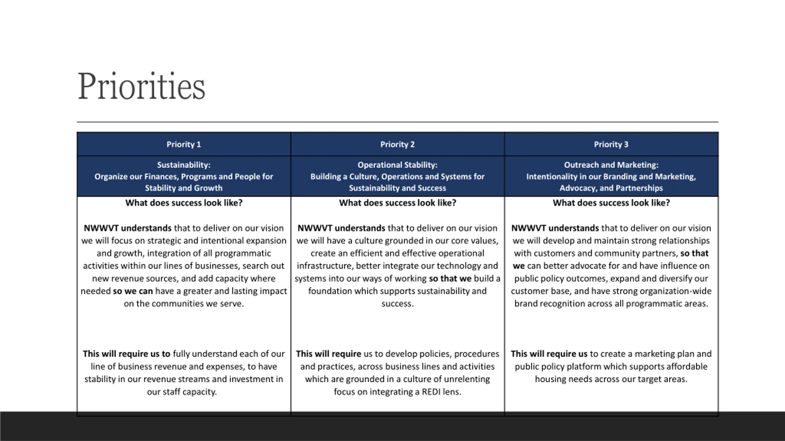 Priorities Priority 1 Priority 2 Priority 3 Sustainability: Operational Stability: Outreach and Marketing: Intentionality in our Branding and Marketing, Advocacy, and Partnerships Organize our Finances, Programs and People for Stability and Growth Building a Culture, Operations and Systems for Sustainability and Success What does success look like? What does success look like? What does success look like? NWWVT understands that to deliver on our vision we will focus on strategic and intentional expansion and growth, integration of all programmatic activities within our lines of businesses, search out new revenue sources, and add capacity where needed so we can have a greater and lasting impact on the communities we serve. NWWVT understands that to deliver on our vision we will have a culture grounded in our core values, create an efficient and effective operational infrastructure, better integrate our technology and systems into our ways of working so that we build a foundation which supports sustainability and success. NWWVT understands that to deliver on our vision we will develop and maintain strong relationships with customers and community partners, so that we can better advocate for and have influence on public policy outcomes, expand and diversify our customer base, and have strong organization-wide brand recognition across all programmatic areas. This will require us to fully understand each of our line of business revenue and expenses, to have stability in our revenue streams and investment in our staff capacity. This will require us to develop policies, procedures and practices, across business lines and activities which are grounded in a culture of unrelenting focus on integrating a REDI lens. This will require us to create a marketing plan and public policy platform which supports affordable housing needs across our target areas.