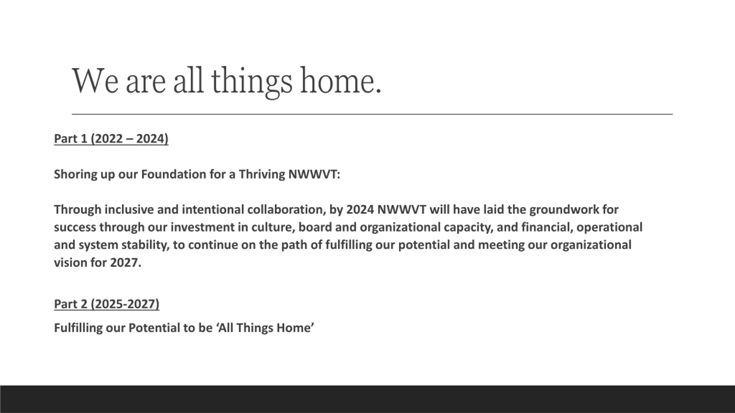 We are all things home. Part 1 (2022 2024) Shoring up our Foundation for a Thriving NWWVT: Through inclusive and intentional collaboration, by 2024 NWWVT will have laid the groundwork for success through our investment in culture, board and organizational capacity, and financial, operational and system stability, to continue on the path of fulfilling our potential and meeting our organizational vision for 2027. Part 2 (2025-2027) Fulfilling our Potential to be All Things Home