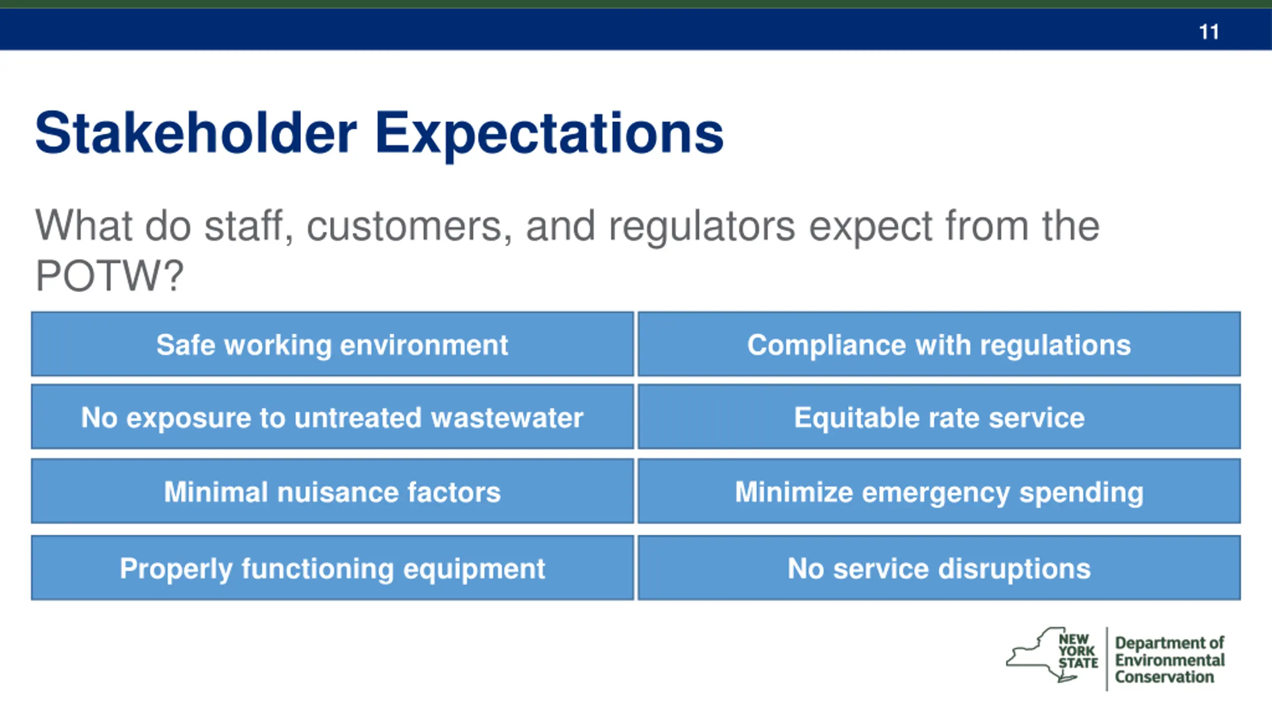 12 Expectations Goals Goals Listening to those complaints presents the opportunity to create goals and commit to the level of service stakeholders expect. Complaints If stakeholder expectations are not met, complaints may be vocalized. Expectations Stakeholders who receive the service from the POTW have expectations.