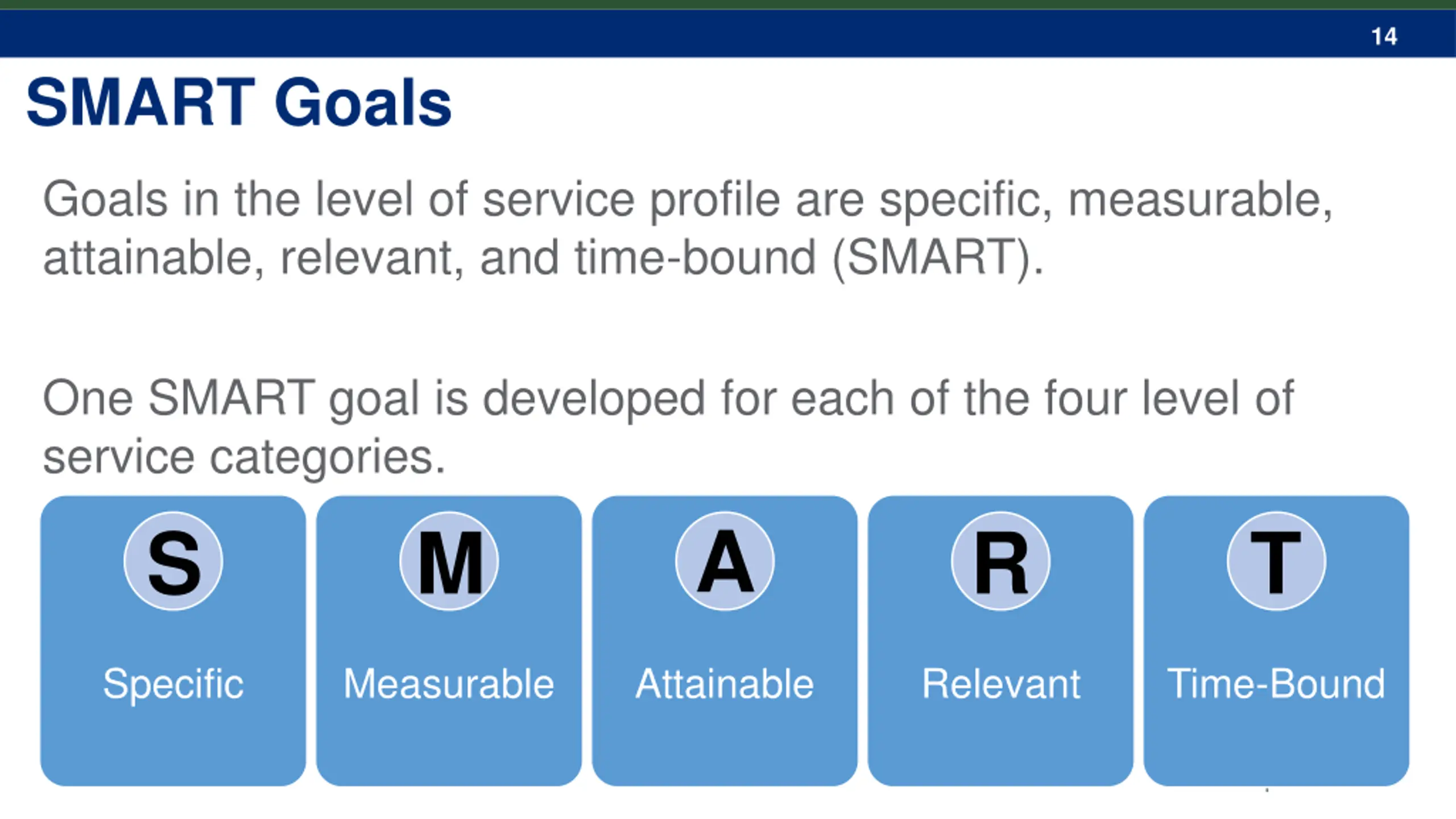 14 SMART Goals Goals in the level of service profile are specific, measurable, attainable, relevant, and time-bound (SMART). One SMART goal is developed for each of the four level of service categories. S M A R T Specific Measurable Attainable Relevant Time-Bound