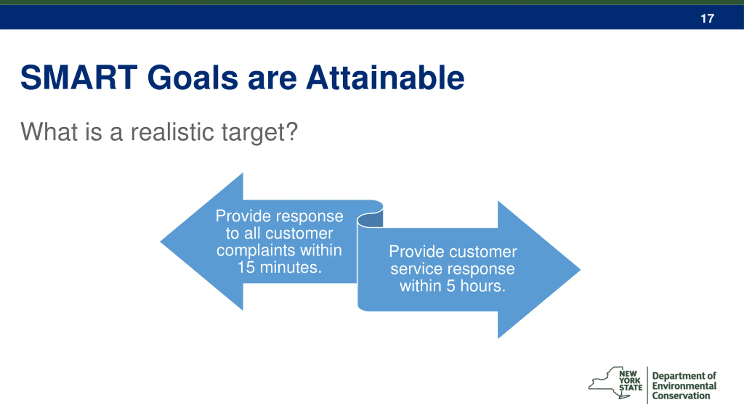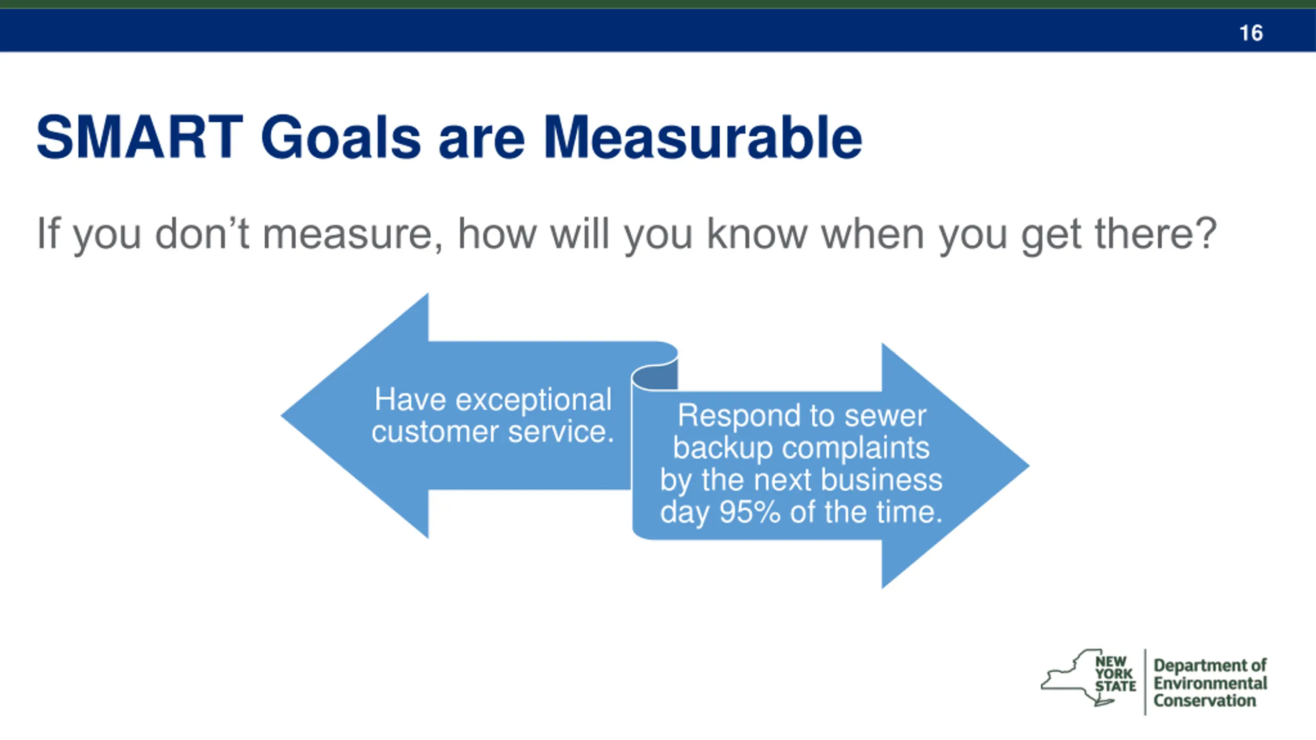 16 SMART Goals are Measurable If you don t measure, how will you know when you get there? Have exceptional customer service. Respond to sewer backup complaints by the next business day 95% of the time.