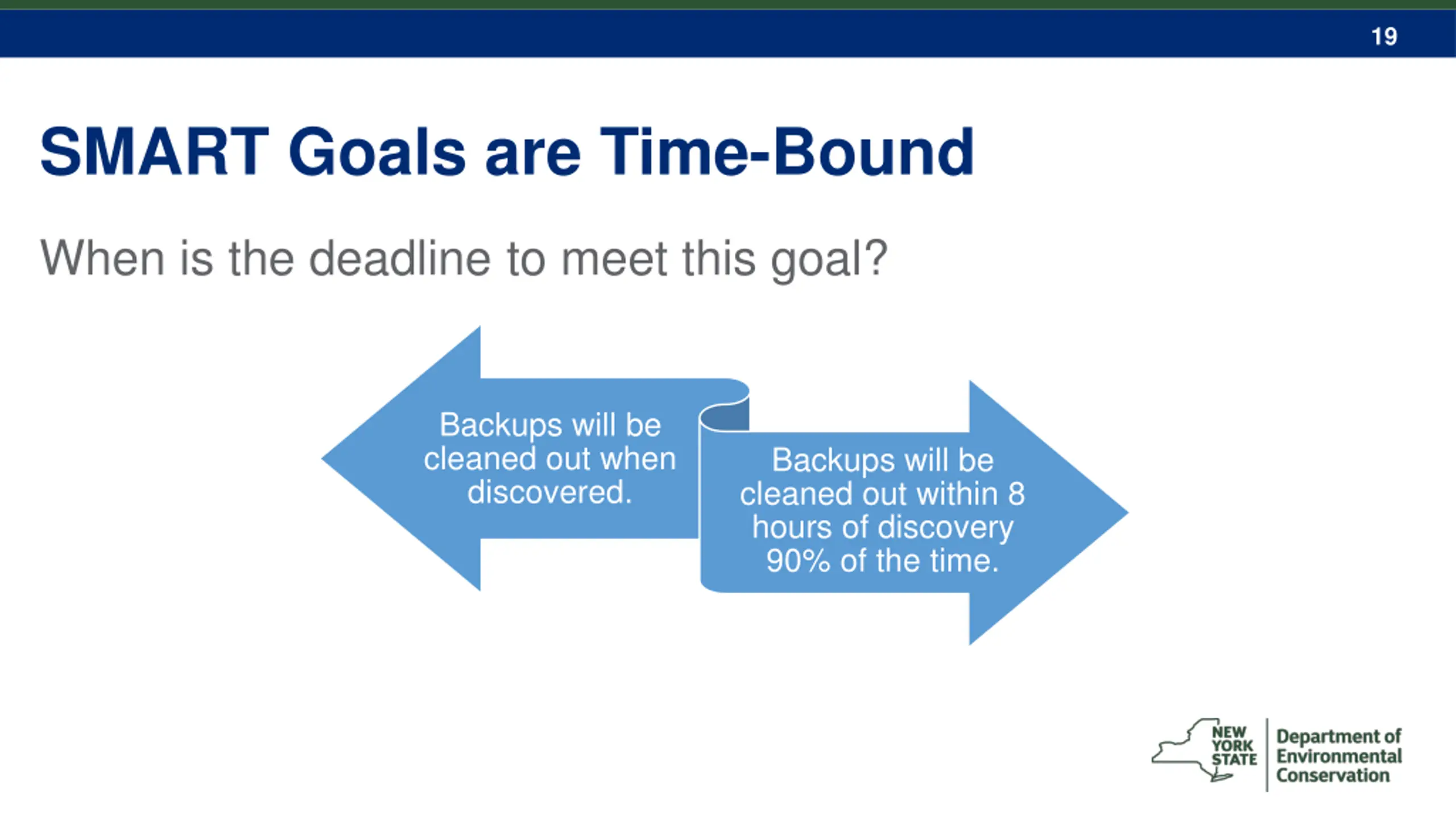 19 SMART Goals are Time-Bound When is the deadline to meet this goal? Backups will be cleaned out when discovered. Backups will be cleaned out within 8 hours of discovery 90% of the time.