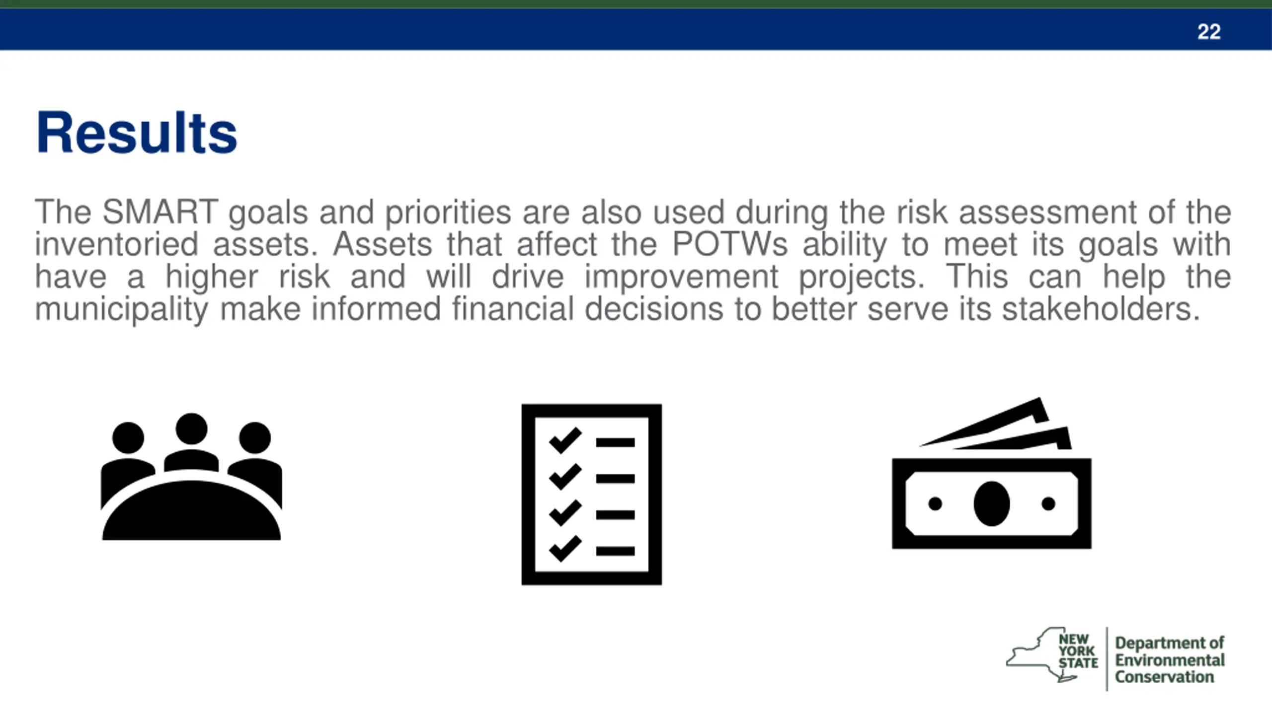 22 Results The SMART goals and priorities are also used during the risk assessment of the inventoried assets. Assets that affect the POTWs ability to meet its goals with have a higher risk and will drive improvement projects. This can help the municipality make informed financial decisions to better serve its stakeholders.