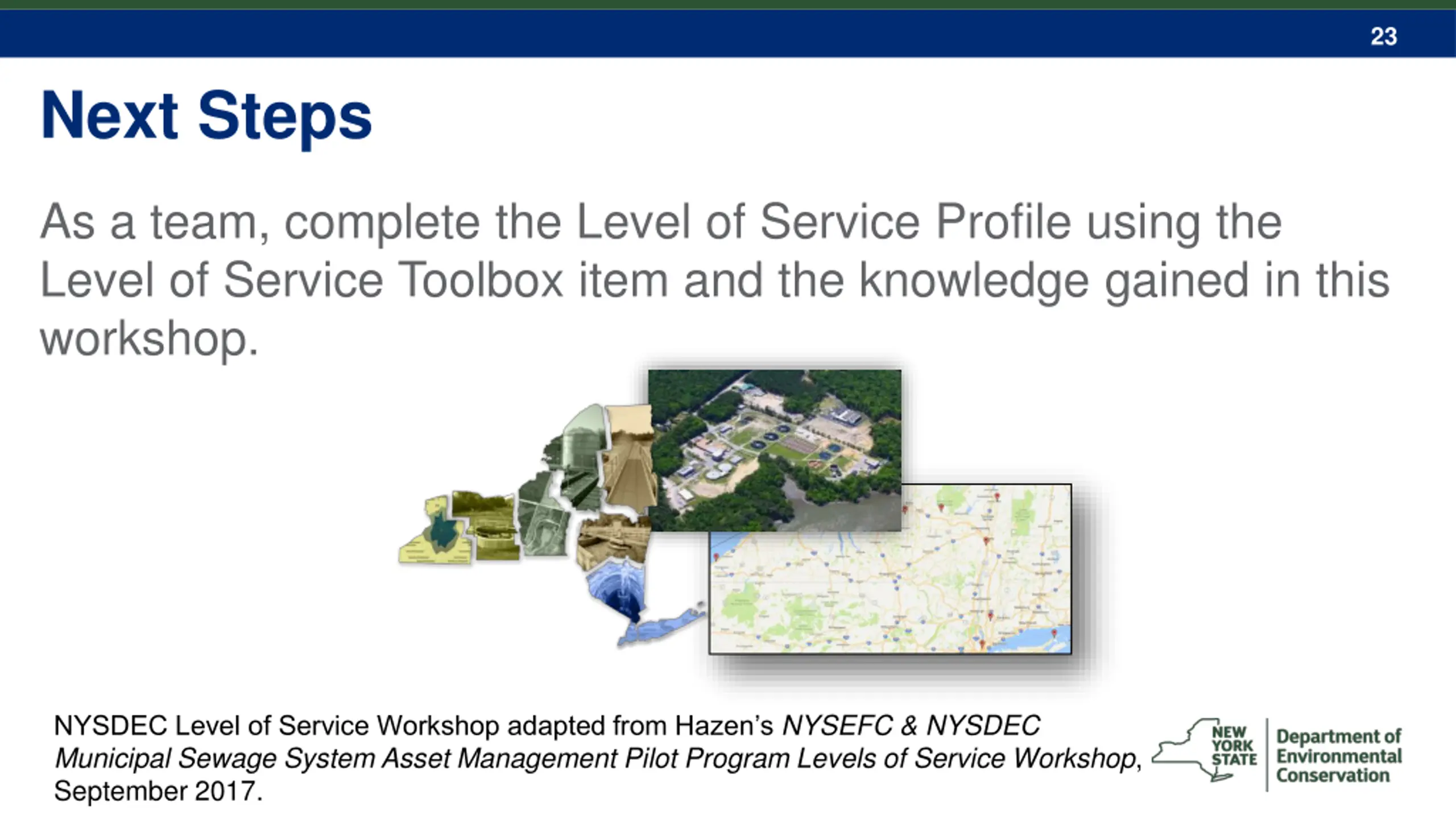 23 Next Steps As a team, complete the Level of Service Profile using the Level of Service Toolbox item and the knowledge gained in this workshop. NYSDEC Level of Service Workshop adapted from Hazen s NYSEFC & NYSDEC Municipal Sewage System Asset Management Pilot Program Levels of Service Workshop, September 2017.