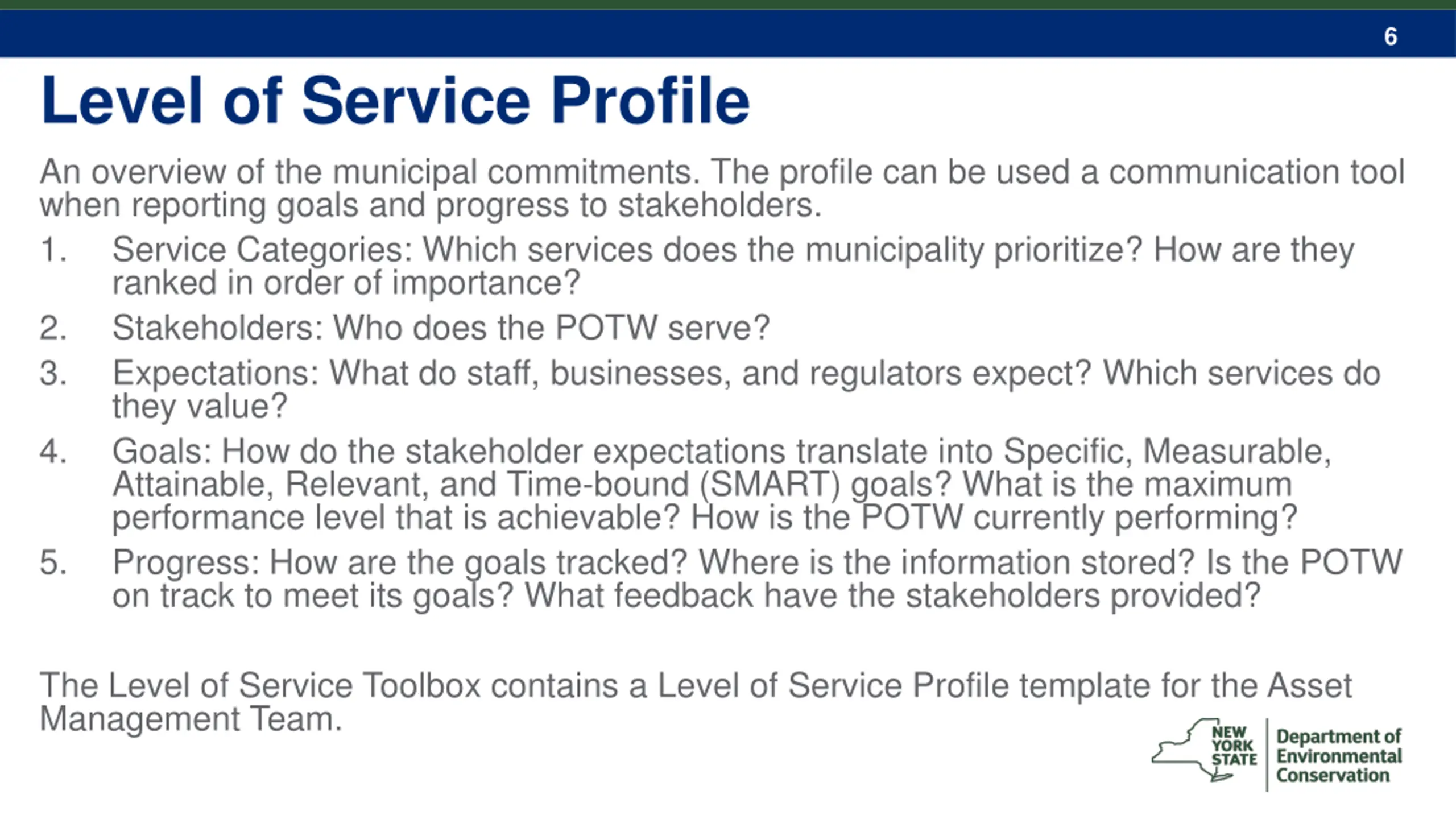 6 Level of Service Profile An overview of the municipal commitments. The profile can be used a communication tool when reporting goals and progress to stakeholders. 1. Service Categories: Which services does the municipality prioritize? How are they ranked in order of importance? 2. Stakeholders: Who does the POTW serve? 3. Expectations: What do staff, businesses, and regulators expect? Which services do they value? 4. Goals: How do the stakeholder expectations translate into Specific, Measurable, Attainable, Relevant, and Time-bound (SMART) goals? What is the maximum performance level that is achievable? How is the POTW currently performing? 5. Progress: How are the goals tracked? Where is the information stored? Is the POTW on track to meet its goals? What feedback have the stakeholders provided? The Level of Service Toolbox contains a Level of Service Profile template for the Asset Management Team.