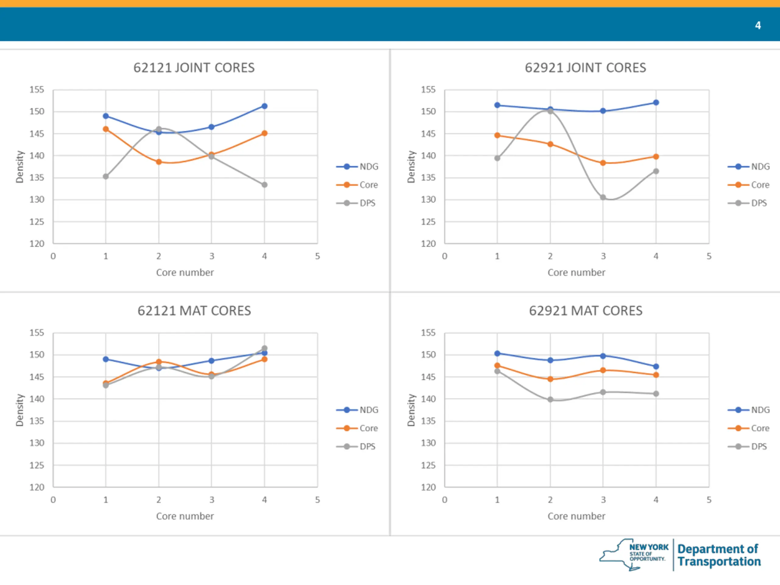 3 Continued work Developing data expectations from a QA point of view Further develop the summary reports and scale back the amount of data collected to reflect acceptance style testing rather than a QC testing. Active promotion NYSDOT regions Contractors Consultants Producers Evaluating Trends Databasing all our data to evaluate trends in the comparisons between the DPS, cores, and nuclear density measurements