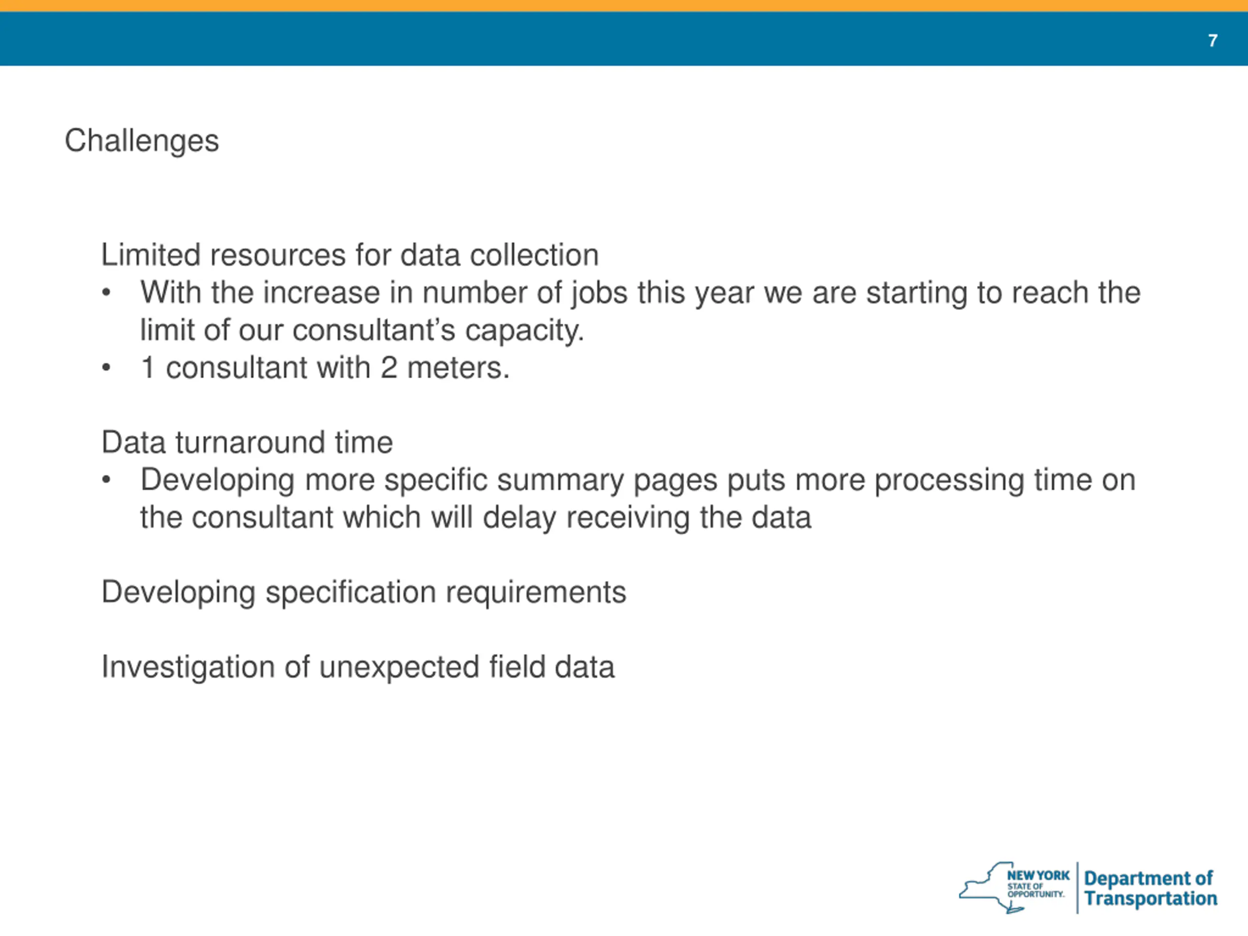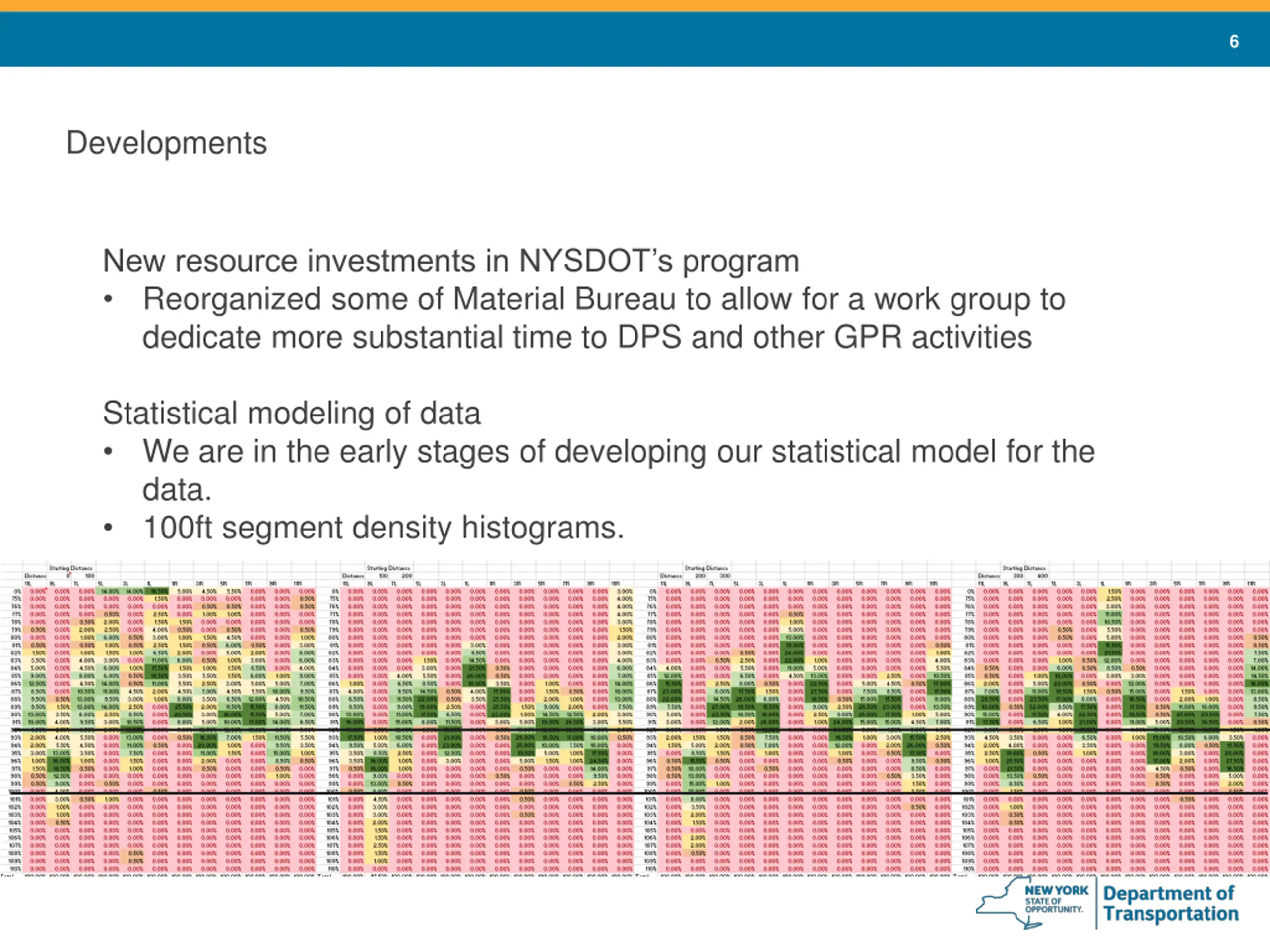 6 Developments New resource investments in NYSDOT s program Reorganized some of Material Bureau to allow for a work group to dedicate more substantial time to DPS and other GPR activities Statistical modeling of data We are in the early stages of developing our statistical model for the data. 100ft segment density histograms.