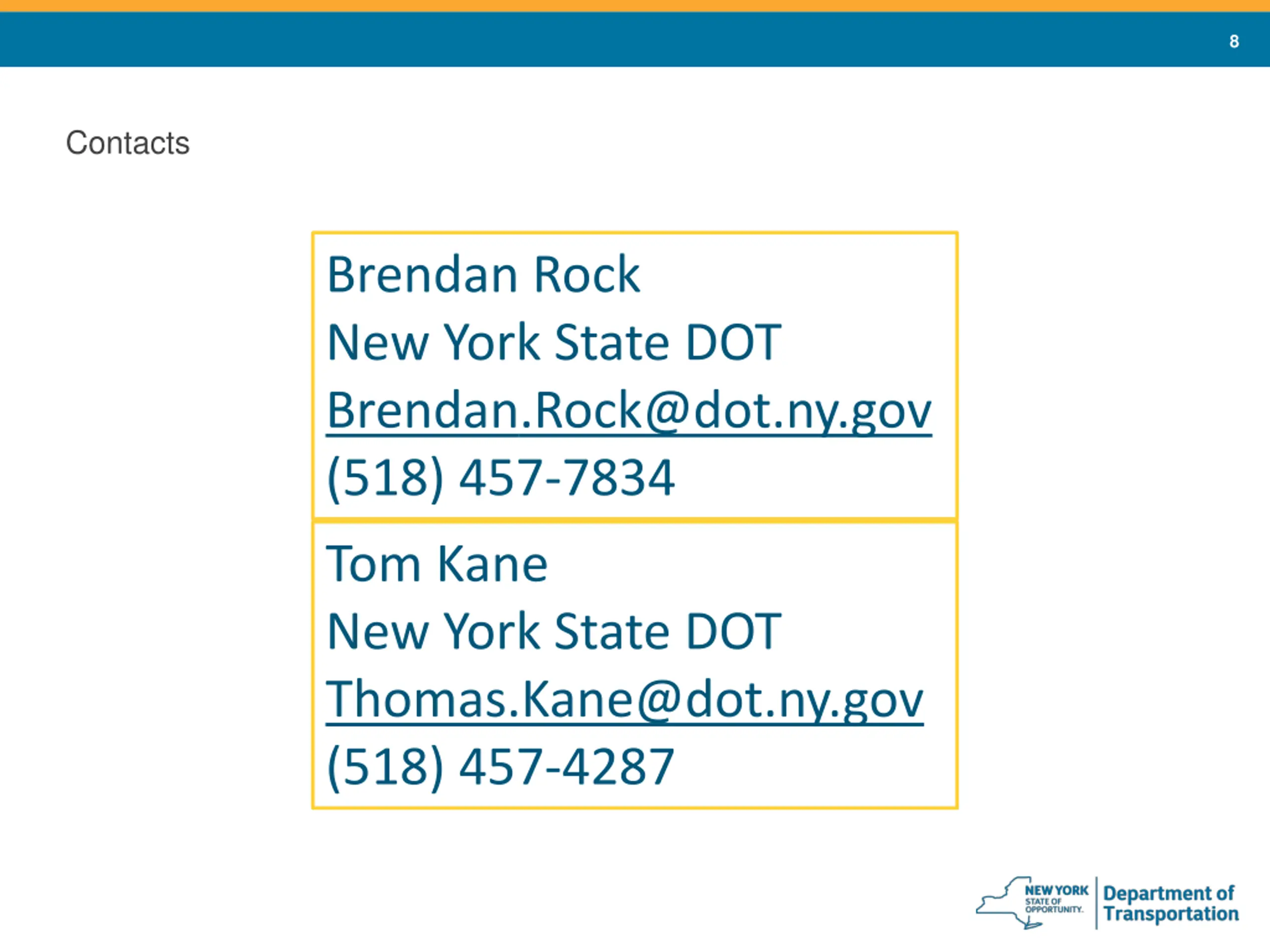 8 Contacts Brendan Rock New York State DOT Brendan.Rock@dot.ny.gov (518) 457-7834 Tom Kane New York State DOT Thomas.Kane@dot.ny.gov (518) 457-4287