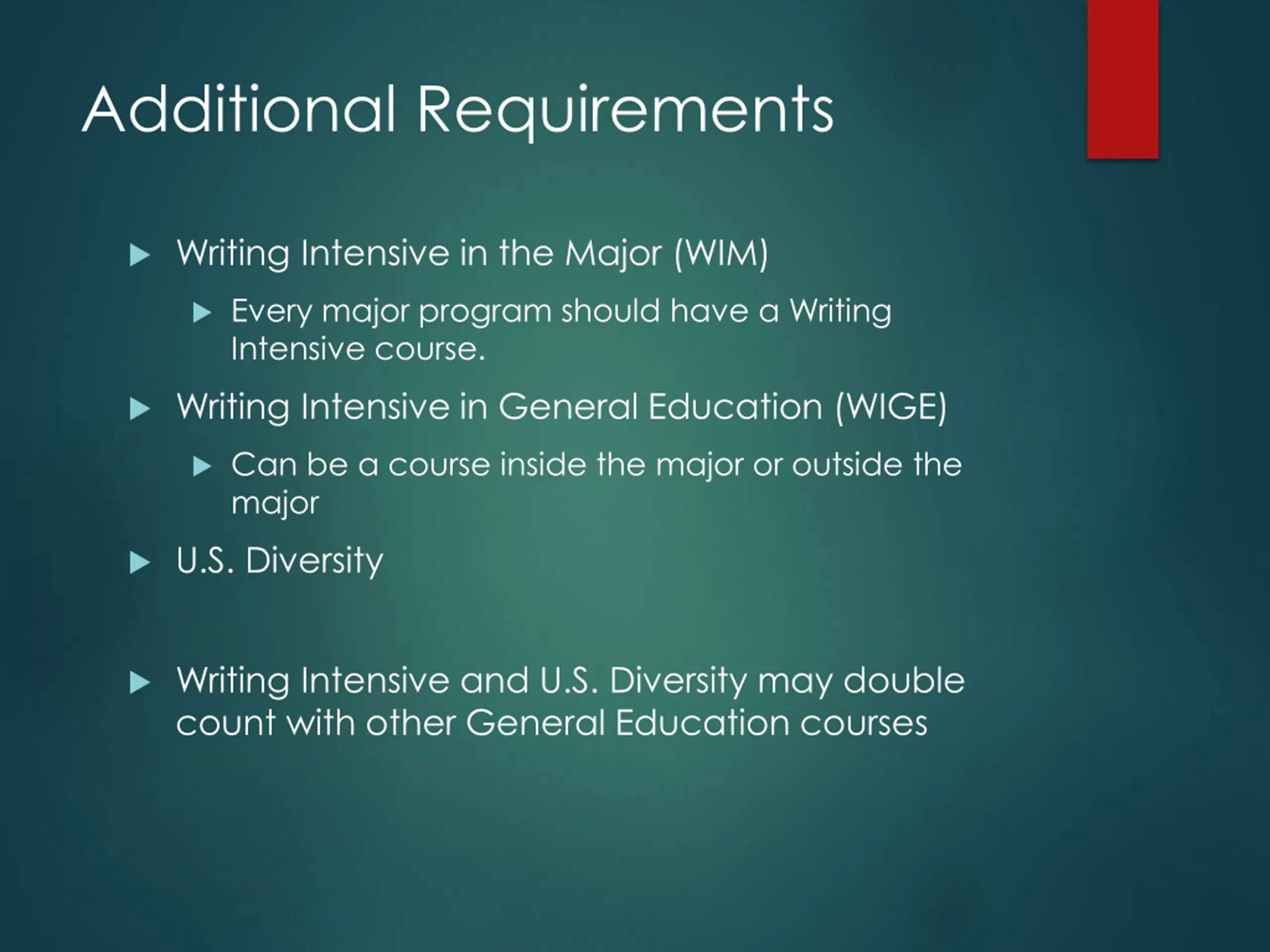 Additional Requirements Writing Intensive in the Major (WIM) Every major program should have a Writing Intensive course. Writing Intensive in General Education (WIGE) Can be a course inside the major or outside the major U.S. Diversity Writing Intensive and U.S. Diversity may double count with other General Education courses