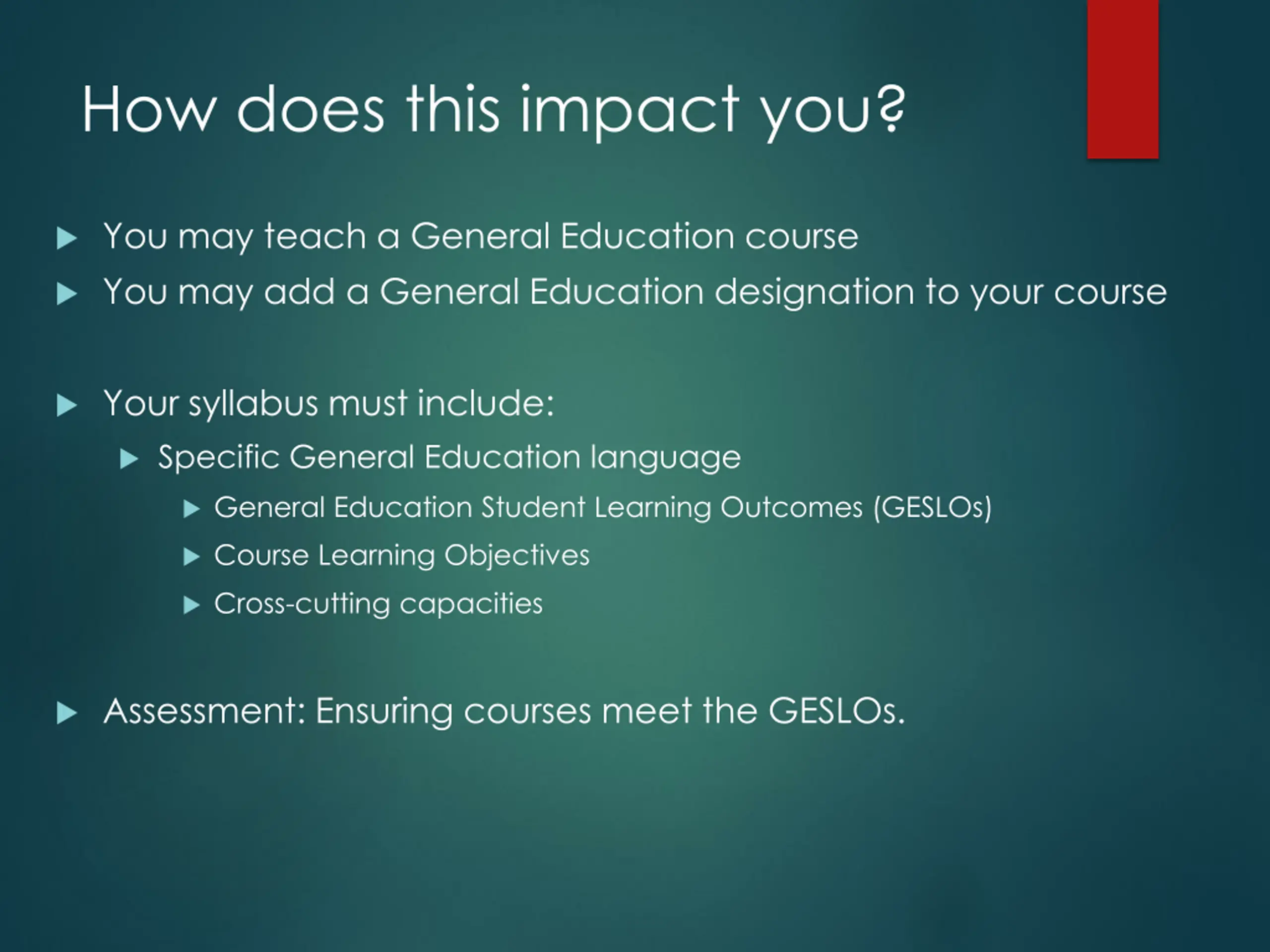 How does this impact you? You may teach a General Education course You may add a General Education designation to your course Your syllabus must include: Specific General Education language General Education Student Learning Outcomes (GESLOs) Course Learning Objectives Cross-cutting capacities Assessment: Ensuring courses meet the GESLOs.