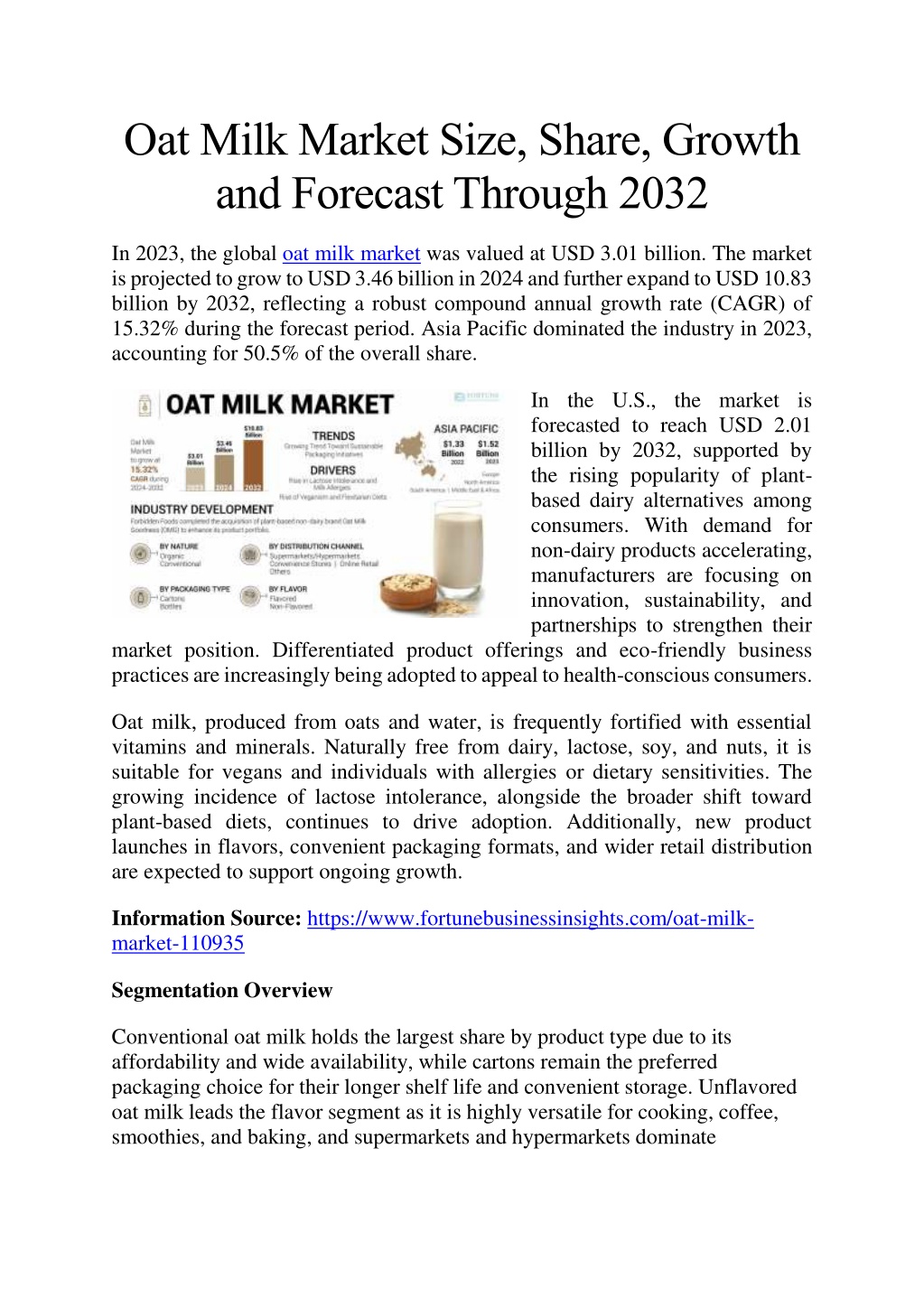 Oat Milk Market Size, Share, Growth and Forecast Through 2032 In 2023, the global oat milk market was valued at USD 3.01 billion. The market is projected to grow to USD 3.46 billion in 2024 and further expand to USD 10.83 billion by 2032, reflecting a robust compound annual growth rate (CAGR) of 15.32% during the forecast period. Asia Pacific dominated the industry in 2023, accounting for 50.5% of the overall share. In the U.S., the market is forecasted to reach USD 2.01 billion by 2032, supported by the rising popularity of plant- based dairy alternatives among consumers. With demand for non-dairy products accelerating, manufacturers are focusing on innovation, sustainability, and partnerships to strengthen their market position. Differentiated product offerings and eco-friendly business practices are increasingly being adopted to appeal to health-conscious consumers. Oat milk, produced from oats and water, is frequently fortified with essential vitamins and minerals. Naturally free from dairy, lactose, soy, and nuts, it is suitable for vegans and individuals with allergies or dietary sensitivities. The growing incidence of lactose intolerance, alongside the broader shift toward plant-based diets, continues to drive adoption. Additionally, new product launches in flavors, convenient packaging formats, and wider retail distribution are expected to support ongoing growth. Information Source: https://www.fortunebusinessinsights.com/oat-milk- market-110935 Segmentation Overview Conventional oat milk holds the largest share by product type due to its affordability and wide availability, while cartons remain the preferred packaging choice for their longer shelf life and convenient storage. Unflavored oat milk leads the flavor segment as it is highly versatile for cooking, coffee, smoothies, and baking, and supermarkets and hypermarkets dominate