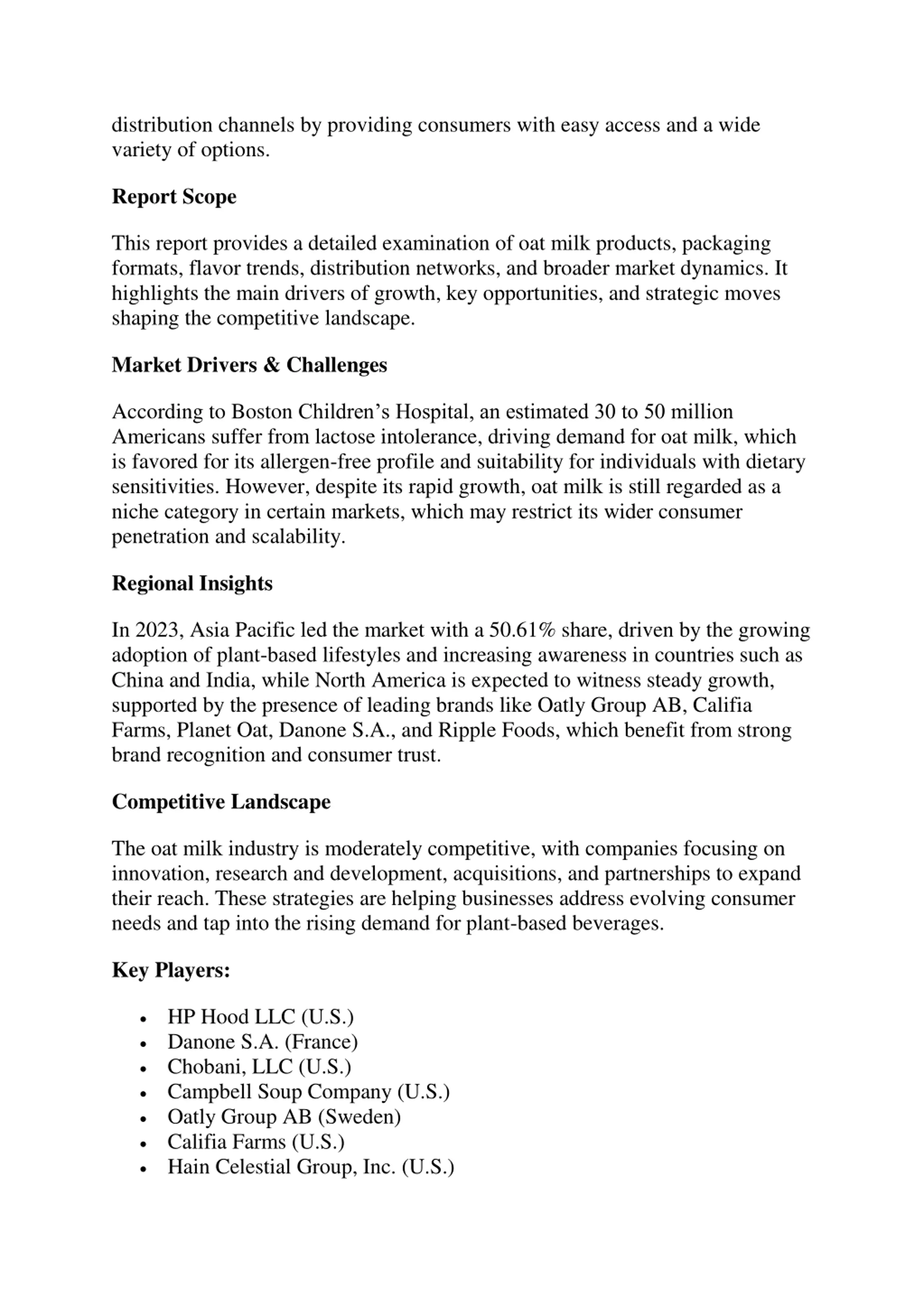 distribution channels by providing consumers with easy access and a wide variety of options. Report Scope This report provides a detailed examination of oat milk products, packaging formats, flavor trends, distribution networks, and broader market dynamics. It highlights the main drivers of growth, key opportunities, and strategic moves shaping the competitive landscape. Market Drivers & Challenges According to Boston Children s Hospital, an estimated 30 to 50 million Americans suffer from lactose intolerance, driving demand for oat milk, which is favored for its allergen-free profile and suitability for individuals with dietary sensitivities. However, despite its rapid growth, oat milk is still regarded as a niche category in certain markets, which may restrict its wider consumer penetration and scalability. Regional Insights In 2023, Asia Pacific led the market with a 50.61% share, driven by the growing adoption of plant-based lifestyles and increasing awareness in countries such as China and India, while North America is expected to witness steady growth, supported by the presence of leading brands like Oatly Group AB, Califia Farms, Planet Oat, Danone S.A., and Ripple Foods, which benefit from strong brand recognition and consumer trust. Competitive Landscape The oat milk industry is moderately competitive, with companies focusing on innovation, research and development, acquisitions, and partnerships to expand their reach. These strategies are helping businesses address evolving consumer needs and tap into the rising demand for plant-based beverages. Key Players: HP Hood LLC (U.S.) Danone S.A. (France) Chobani, LLC (U.S.) Campbell Soup Company (U.S.) Oatly Group AB (Sweden) Califia Farms (U.S.) Hain Celestial Group, Inc. (U.S.)