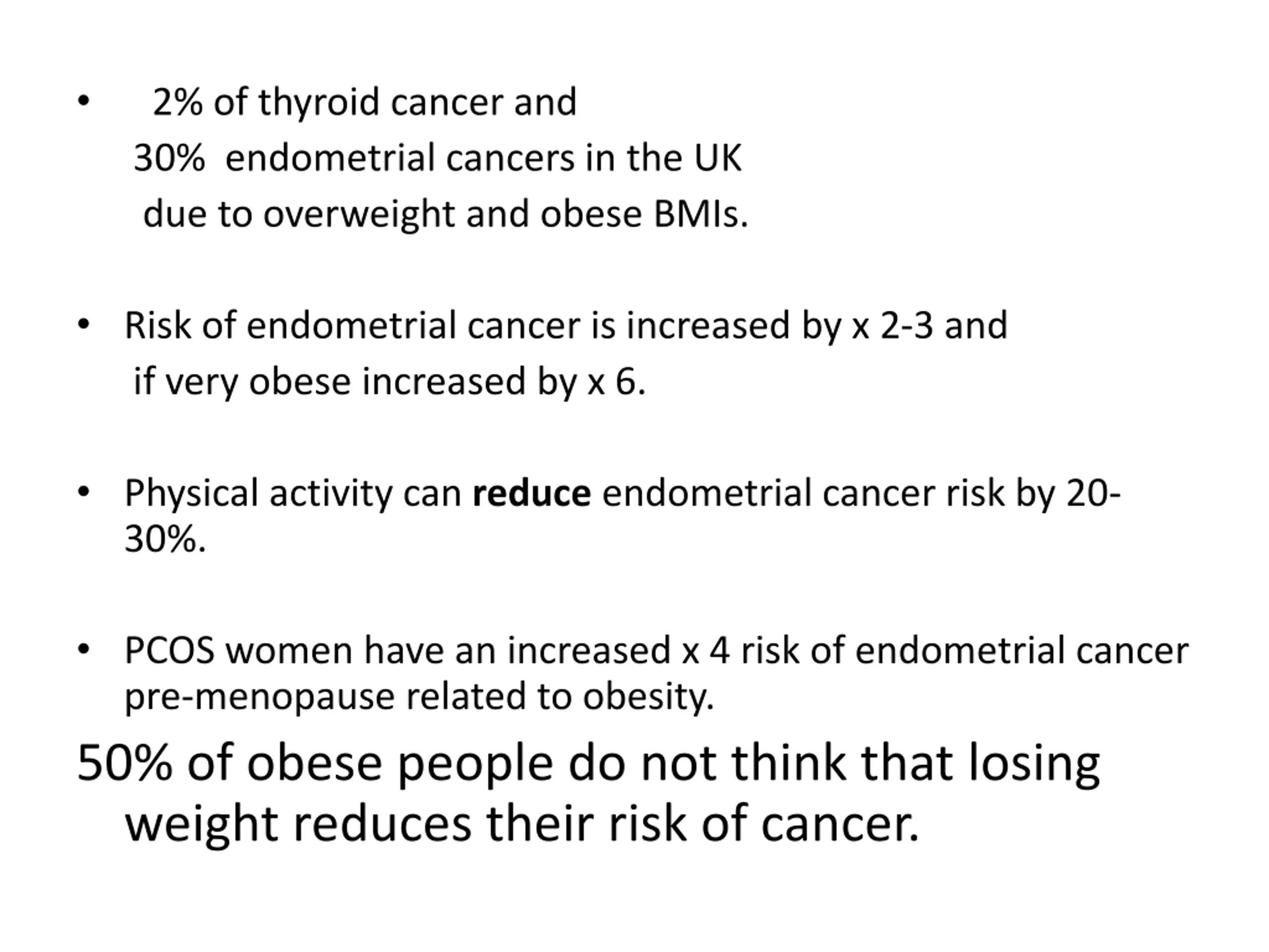 2% of thyroid cancer and 30% endometrial cancers in the UK due to overweight and obese BMIs. Risk of endometrial cancer is increased by x 2-3 and if very obese increased by x 6. Physical activity can reduce endometrial cancer risk by 20- 30%. PCOS women have an increased x 4 risk of endometrial cancer pre-menopause related to obesity. 50% of obese people do not think that losing weight reduces their risk of cancer.