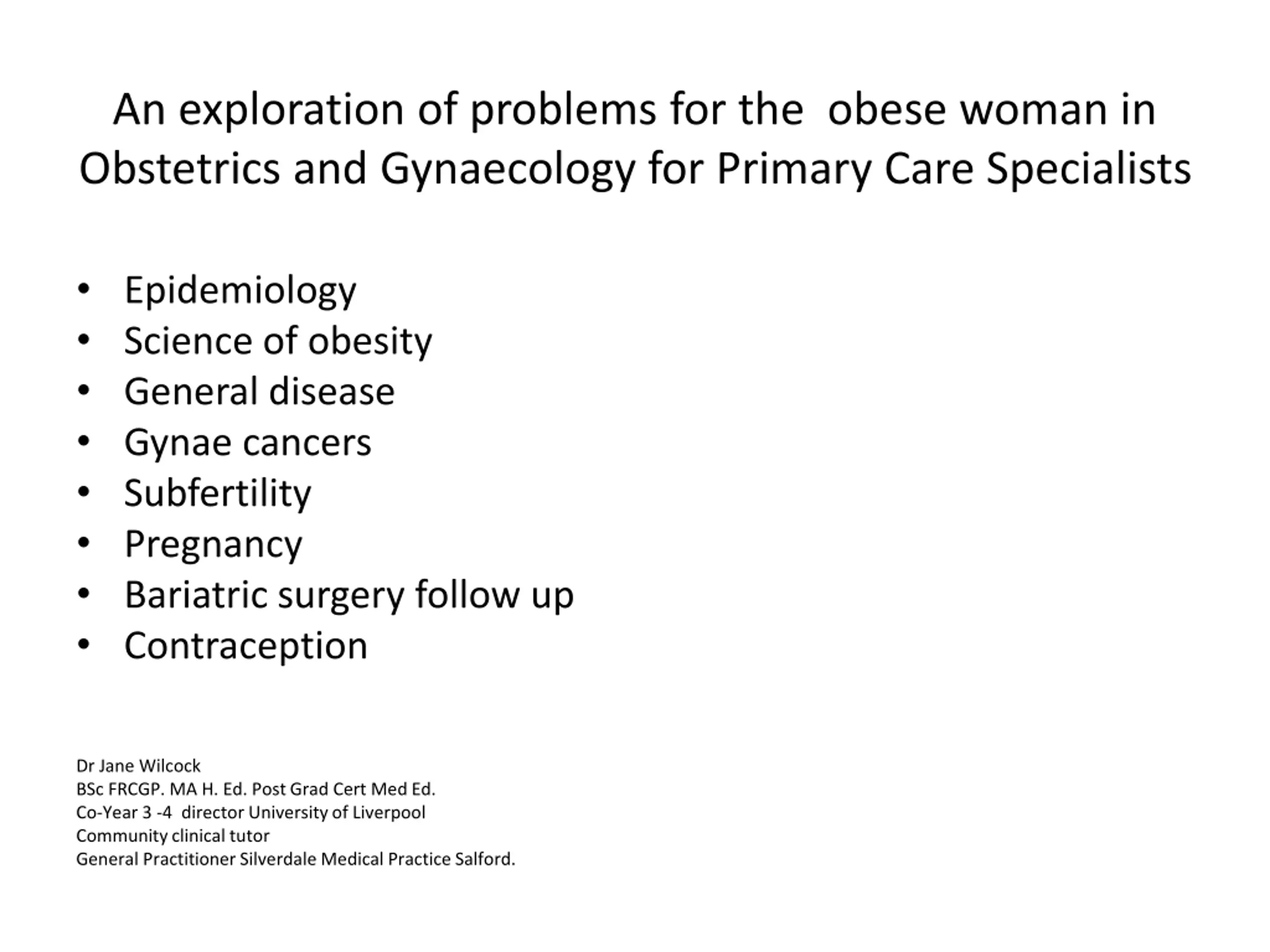 An exploration of problems for the obese woman in Obstetrics and Gynaecology for Primary Care Specialists Epidemiology Science of obesity General disease Gynae cancers Subfertility Pregnancy Bariatric surgery follow up Contraception Dr Jane Wilcock BSc FRCGP. MA H. Ed. Post Grad Cert Med Ed. Co-Year 3 -4 director University of Liverpool Community clinical tutor General Practitioner Silverdale Medical Practice Salford.