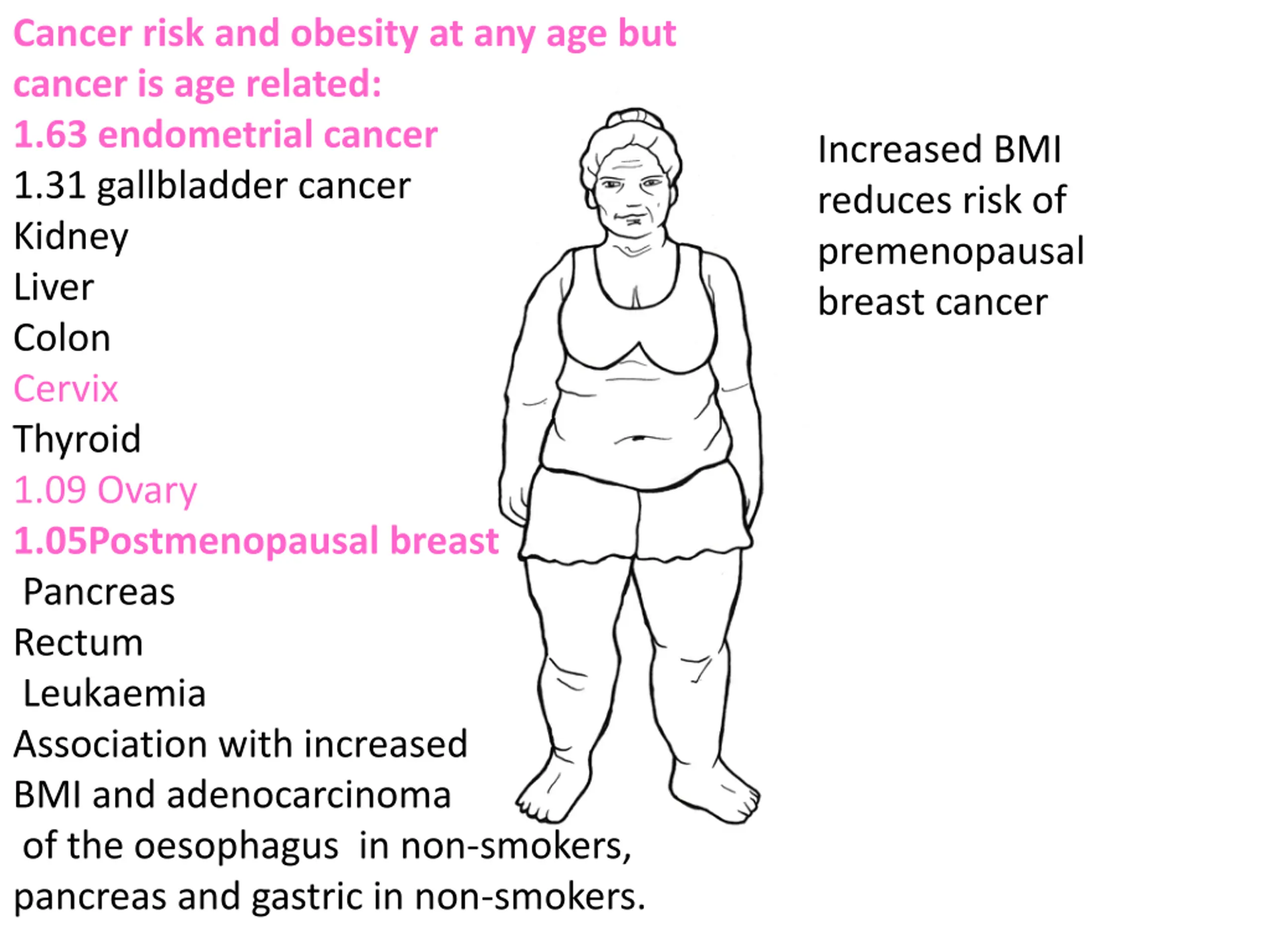 Cancer risk and obesity at any age but cancer is age related: 1.63 endometrial cancer 1.31 gallbladder cancer Kidney Liver Colon Cervix Thyroid 1.09 Ovary 1.05Postmenopausal breast Pancreas Rectum Leukaemia Association with increased BMI and adenocarcinoma of the oesophagus in non-smokers, pancreas and gastric in non-smokers. Increased BMI reduces risk of premenopausal breast cancer
