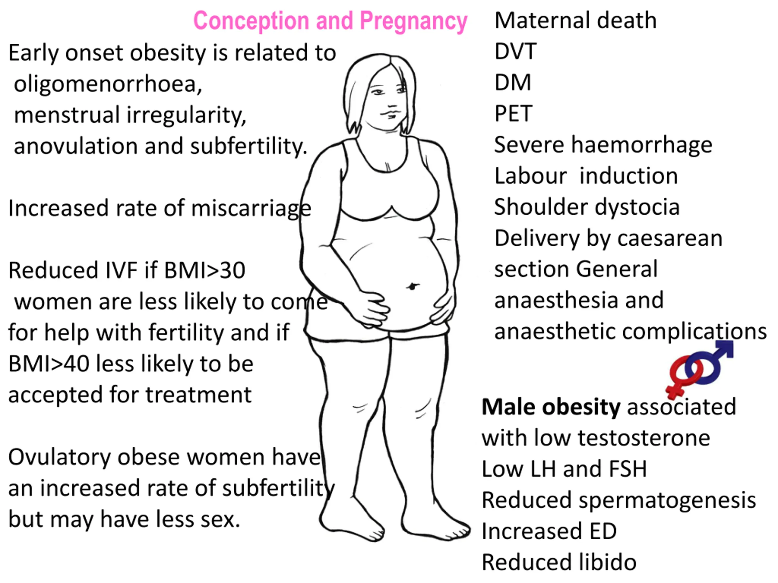 Conception and Pregnancy Maternal death DVT DM PET Severe haemorrhage Labour induction Shoulder dystocia Delivery by caesarean section General anaesthesia and anaesthetic complications Early onset obesity is related to oligomenorrhoea, menstrual irregularity, anovulation and subfertility. Increased rate of miscarriage Reduced IVF if BMI>30 women are less likely to come for help with fertility and if BMI>40 less likely to be accepted for treatment Male obesity associated with low testosterone Low LH and FSH Reduced spermatogenesis Increased ED Reduced libido Ovulatory obese women have an increased rate of subfertility but may have less sex.