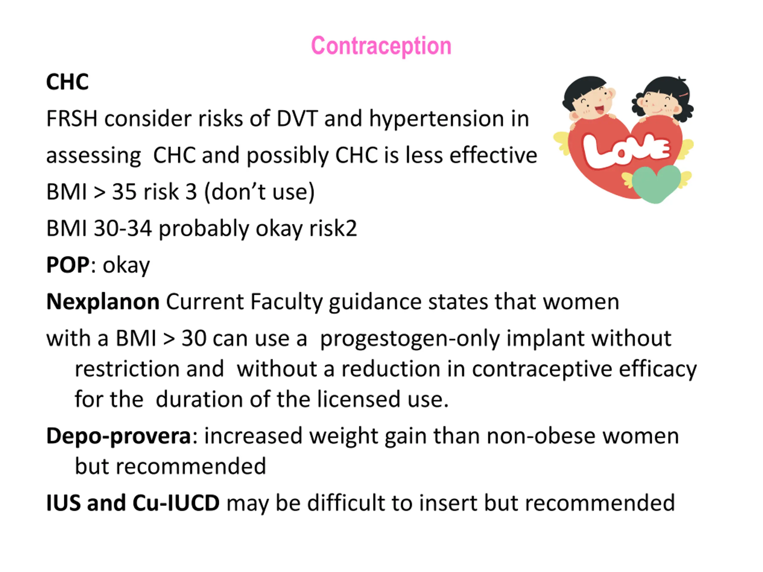 Contraception CHC FRSH consider risks of DVT and hypertension in assessing CHC and possibly CHC is less effective BMI > 35 risk 3 (don t use) BMI 30-34 probably okay risk2 POP: okay Nexplanon Current Faculty guidance states that women with a BMI > 30 can use a progestogen-only implant without restriction and without a reduction in contraceptive efficacy for the duration of the licensed use. Depo-provera: increased weight gain than non-obese women but recommended IUS and Cu-IUCD may be difficult to insert but recommended