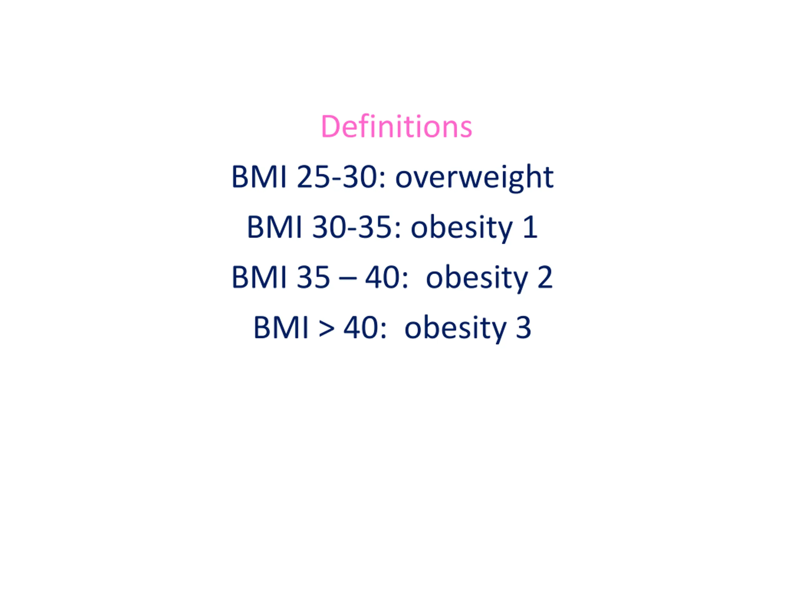Definitions BMI 25-30: overweight BMI 30-35: obesity 1 BMI 35 40: obesity 2 BMI > 40: obesity 3