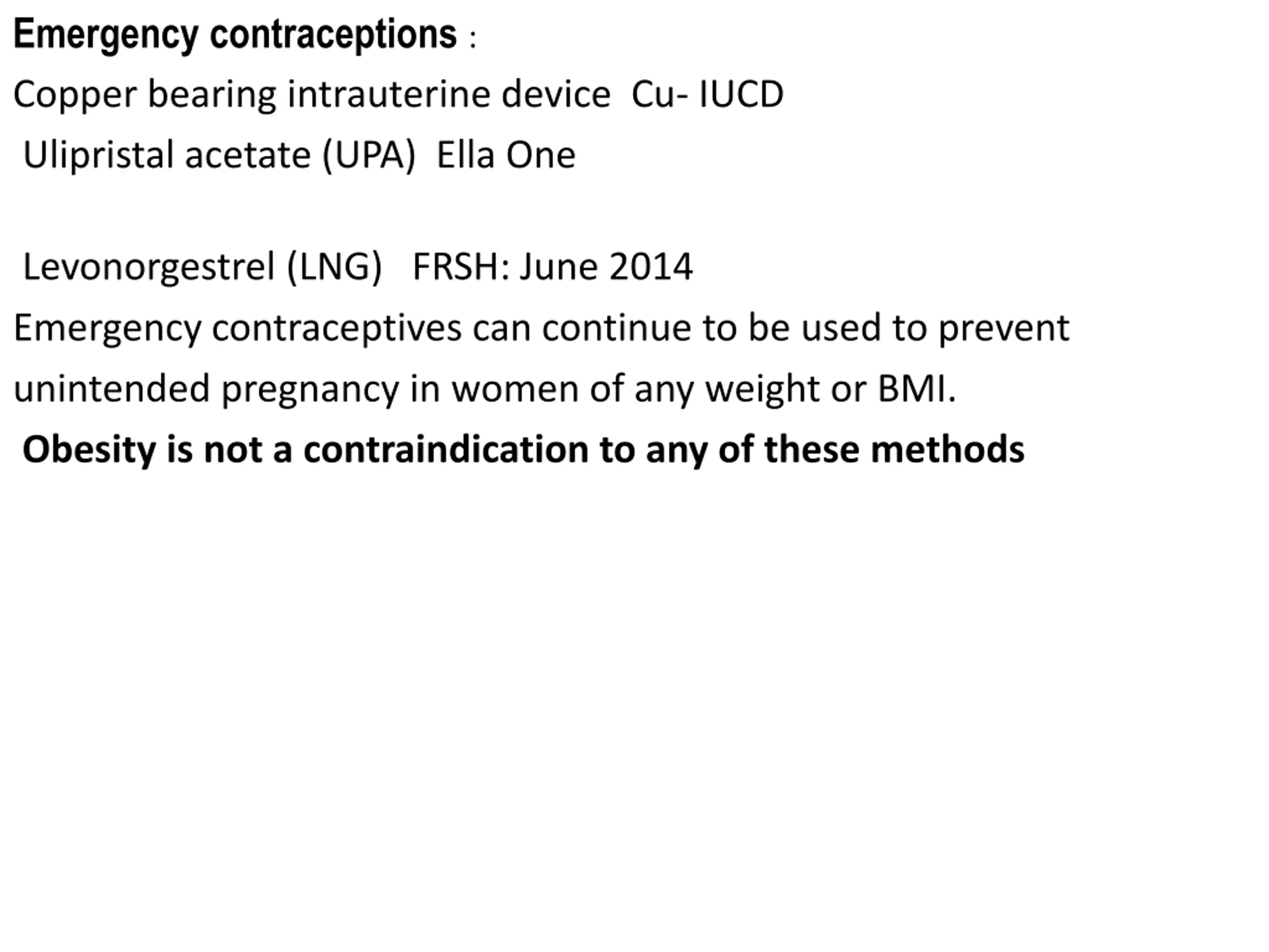 Emergency contraceptions : Copper bearing intrauterine device Cu- IUCD Ulipristal acetate (UPA) Ella One Levonorgestrel (LNG) FRSH: June 2014 Emergency contraceptives can continue to be used to prevent unintended pregnancy in women of any weight or BMI. Obesity is not a contraindication to any of these methods