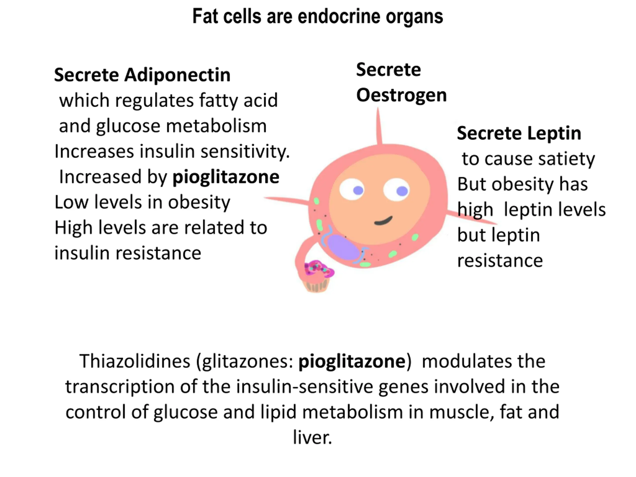 Fat cells are endocrine organs Secrete Oestrogen Secrete Adiponectin which regulates fatty acid and glucose metabolism Increases insulin sensitivity. Increased by pioglitazone Low levels in obesity High levels are related to insulin resistance Secrete Leptin to cause satiety But obesity has high leptin levels but leptin resistance Thiazolidines (glitazones: pioglitazone) modulates the transcription of the insulin-sensitive genes involved in the control of glucose and lipid metabolism in muscle, fat and liver.