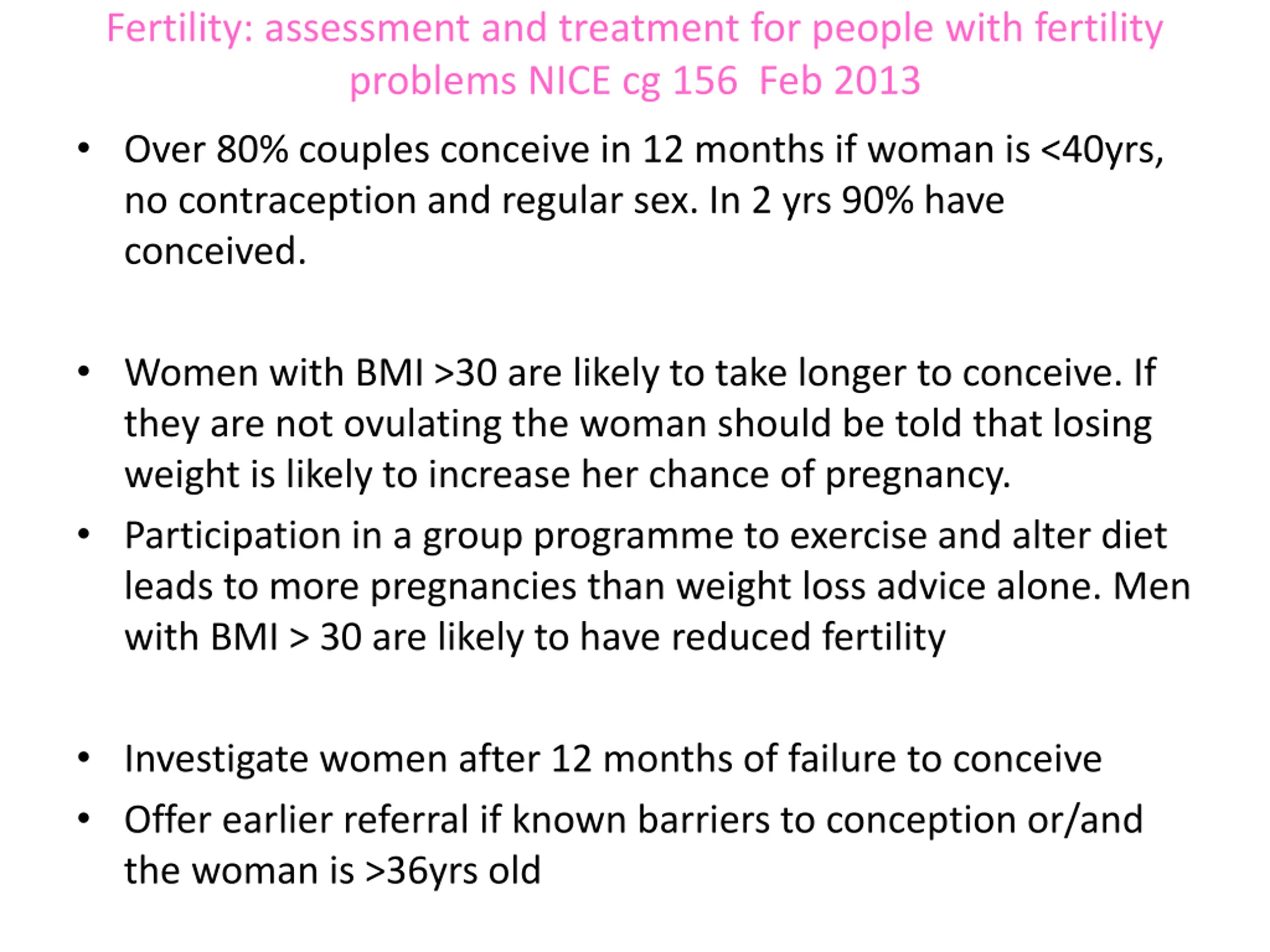 Fertility: assessment and treatment for people with fertility problems NICE cg 156 Feb 2013 Over 80% couples conceive in 12 months if woman is <40yrs, no contraception and regular sex. In 2 yrs 90% have conceived. Women with BMI >30 are likely to take longer to conceive. If they are not ovulating the woman should be told that losing weight is likely to increase her chance of pregnancy. Participation in a group programme to exercise and alter diet leads to more pregnancies than weight loss advice alone. Men with BMI > 30 are likely to have reduced fertility Investigate women after 12 months of failure to conceive Offer earlier referral if known barriers to conception or/and the woman is >36yrs old