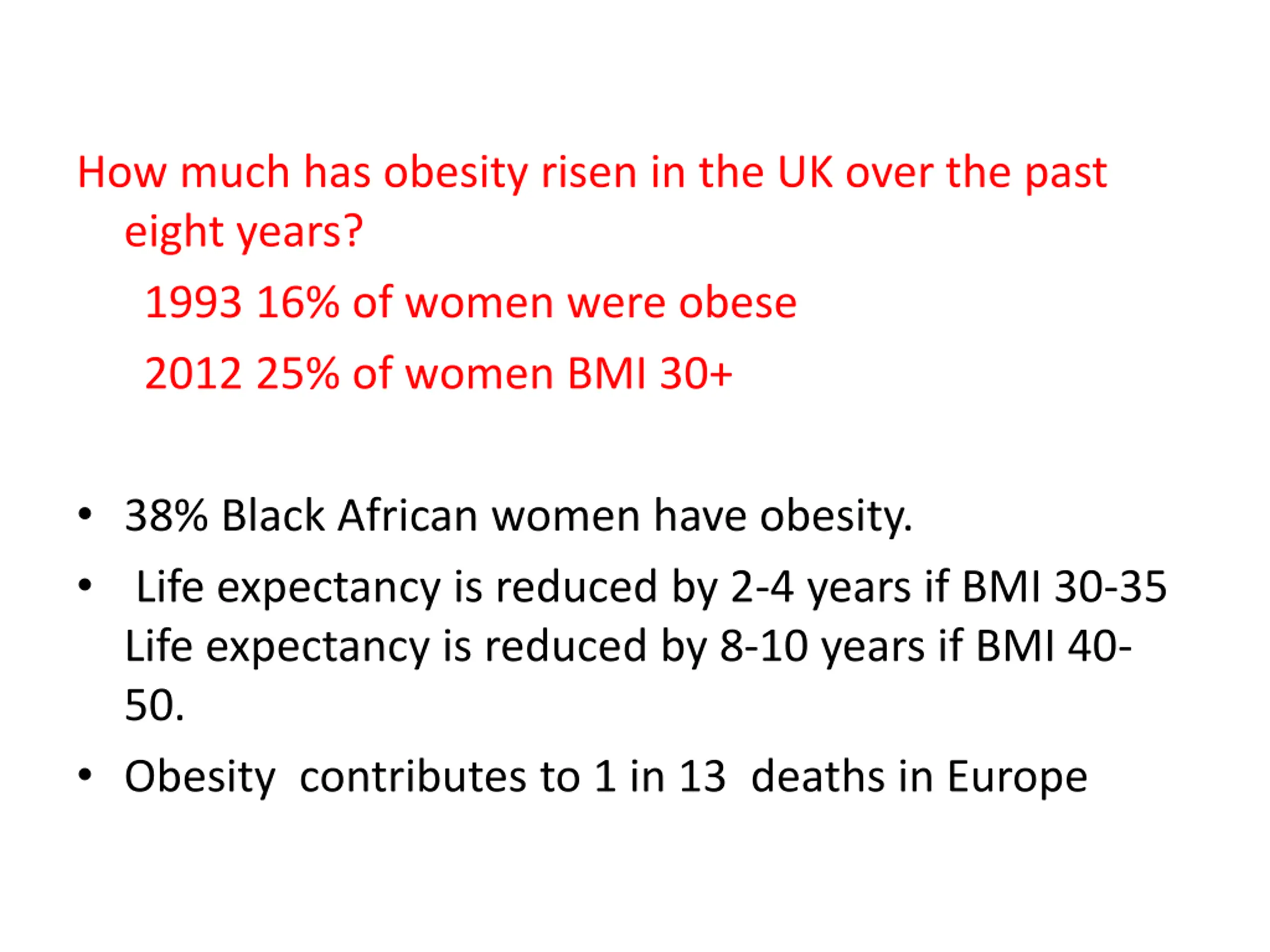 How much has obesity risen in the UK over the past eight years? 1993 16% of women were obese 2012 25% of women BMI 30+ 38% Black African women have obesity. Life expectancy is reduced by 2-4 years if BMI 30-35 Life expectancy is reduced by 8-10 years if BMI 40- 50. Obesity contributes to 1 in 13 deaths in Europe
