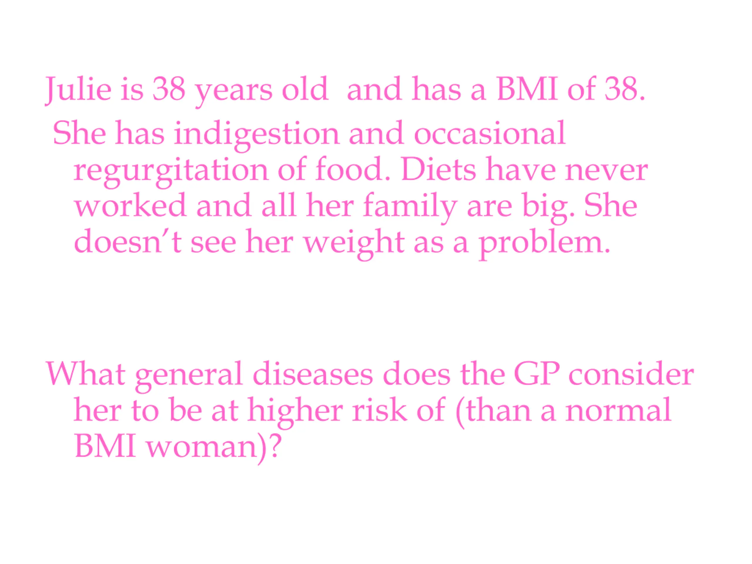 Julie is 38 years old and has a BMI of 38. She has indigestion and occasional regurgitation of food. Diets have never worked and all her family are big. She doesn t see her weight as a problem. What general diseases does the GP consider her to be at higher risk of (than a normal BMI woman)?