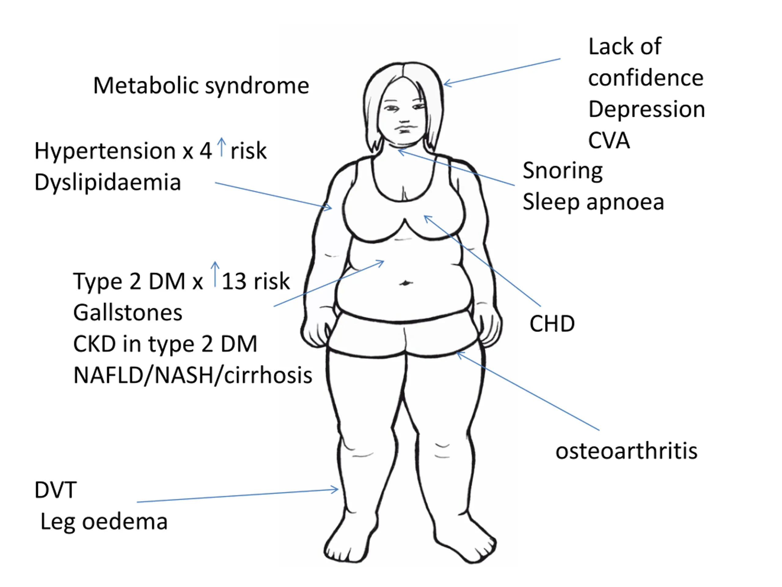 Lack of confidence Depression CVA Metabolic syndrome Hypertension x 4 risk Dyslipidaemia Snoring Sleep apnoea Type 2 DM x 13 risk Gallstones CKD in type 2 DM NAFLD/NASH/cirrhosis CHD osteoarthritis DVT Leg oedema