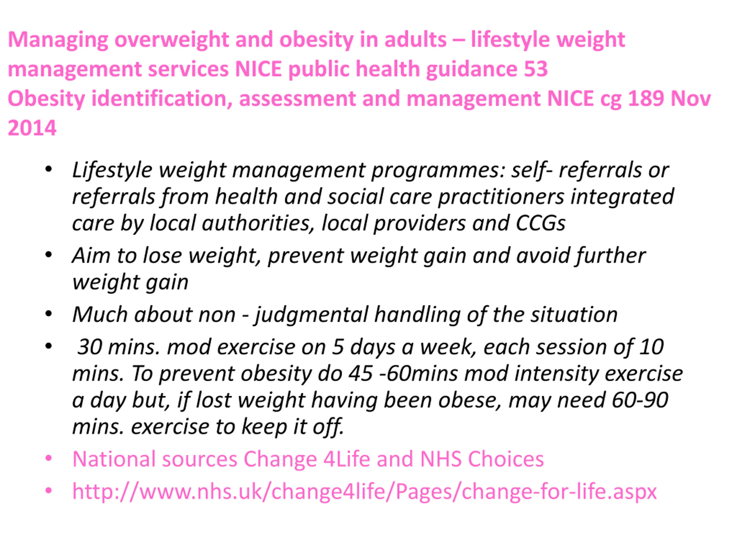 Managing overweight and obesity in adults lifestyle weight management services NICE public health guidance 53 Obesity identification, assessment and management NICE cg 189 Nov 2014 Lifestyle weight management programmes: self- referrals or referrals from health and social care practitioners integrated care by local authorities, local providers and CCGs Aim to lose weight, prevent weight gain and avoid further weight gain Much about non - judgmental handling of the situation 30 mins. mod exercise on 5 days a week, each session of 10 mins. To prevent obesity do 45 -60mins mod intensity exercise a day but, if lost weight having been obese, may need 60-90 mins. exercise to keep it off. National sources Change 4Life and NHS Choices http://www.nhs.uk/change4life/Pages/change-for-life.aspx