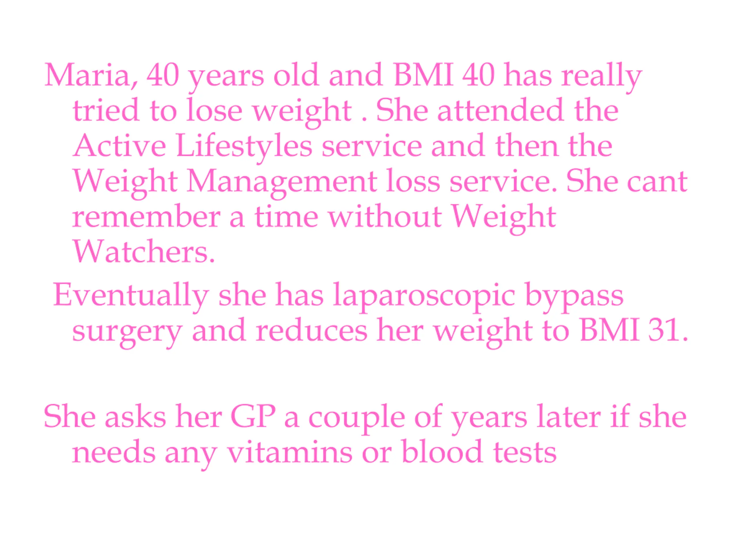 Maria, 40 years old and BMI 40 has really tried to lose weight . She attended the Active Lifestyles service and then the Weight Management loss service. She cant remember a time without Weight Watchers. Eventually she has laparoscopic bypass surgery and reduces her weight to BMI 31. She asks her GP a couple of years later if she needs any vitamins or blood tests