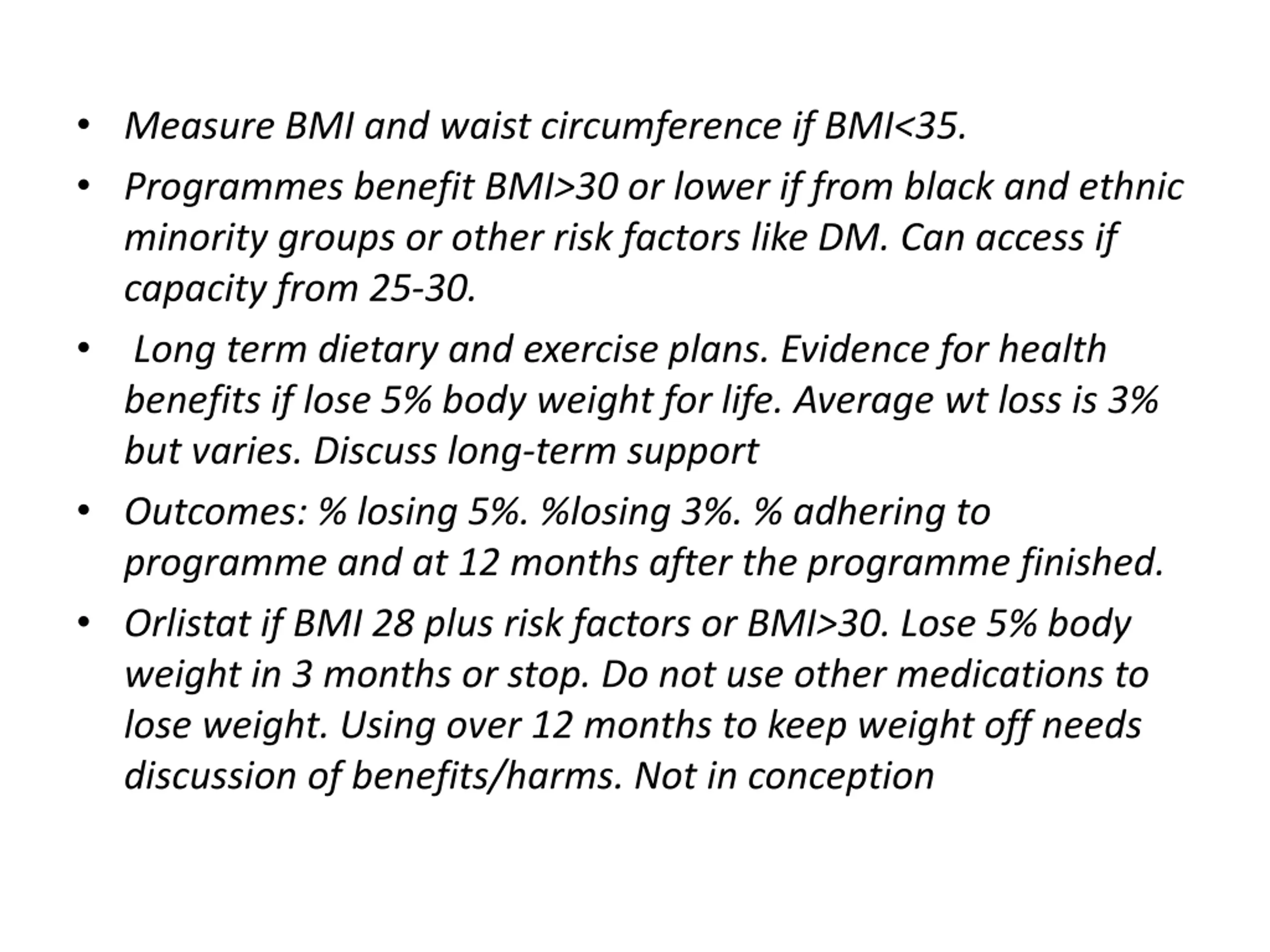 Measure BMI and waist circumference if BMI<35. Programmes benefit BMI>30 or lower if from black and ethnic minority groups or other risk factors like DM. Can access if capacity from 25-30. Long term dietary and exercise plans. Evidence for health benefits if lose 5% body weight for life. Average wt loss is 3% but varies. Discuss long-term support Outcomes: % losing 5%. %losing 3%. % adhering to programme and at 12 months after the programme finished. Orlistat if BMI 28 plus risk factors or BMI>30. Lose 5% body weight in 3 months or stop. Do not use other medications to lose weight. Using over 12 months to keep weight off needs discussion of benefits/harms. Not in conception