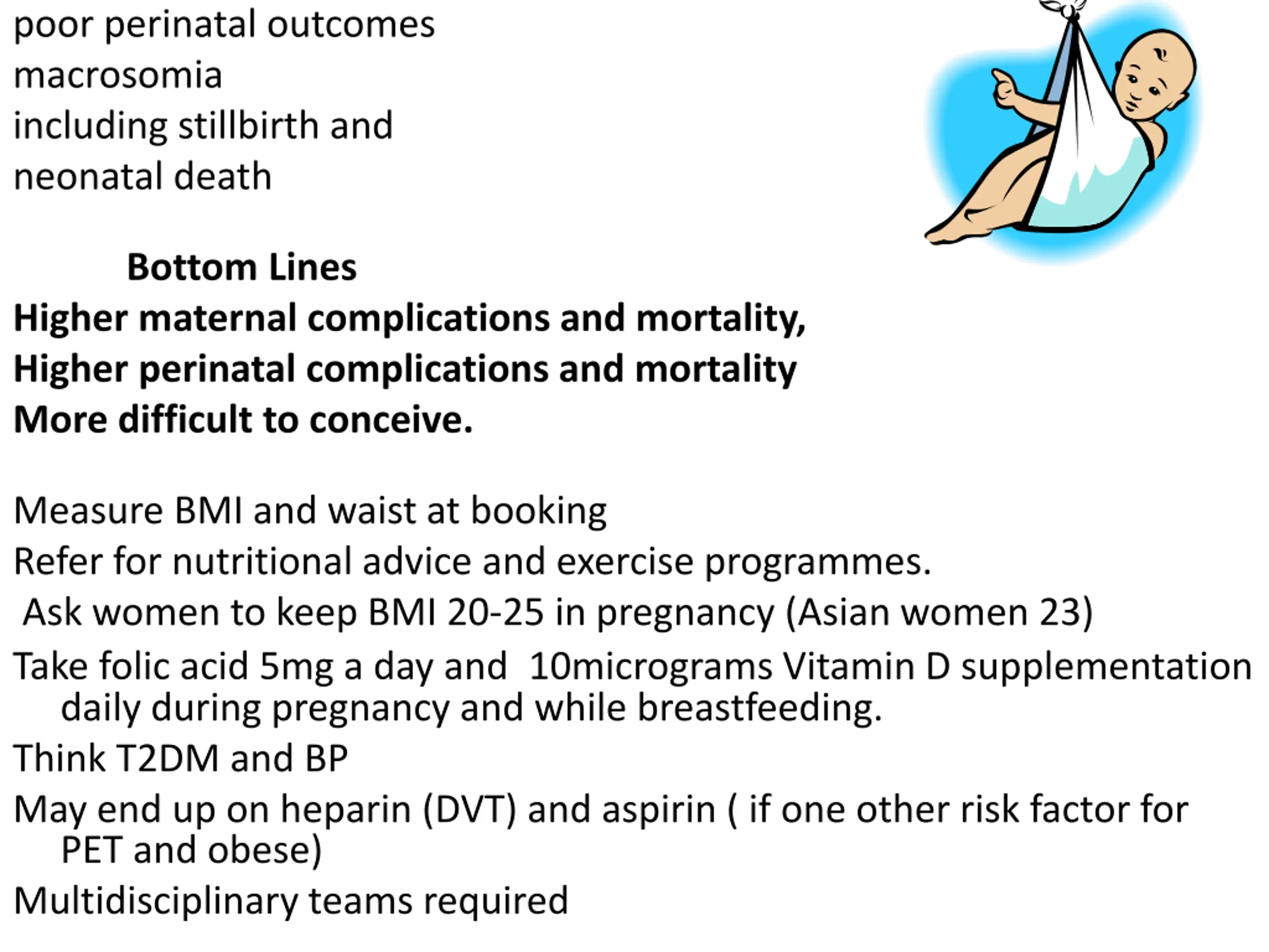 poor perinatal outcomes macrosomia including stillbirth and neonatal death Bottom Lines Higher maternal complications and mortality, Higher perinatal complications and mortality More difficult to conceive. Measure BMI and waist at booking Refer for nutritional advice and exercise programmes. Ask women to keep BMI 20-25 in pregnancy (Asian women 23) Take folic acid 5mg a day and 10micrograms Vitamin D supplementation daily during pregnancy and while breastfeeding. Think T2DM and BP May end up on heparin (DVT) and aspirin ( if one other risk factor for PET and obese) Multidisciplinary teams required