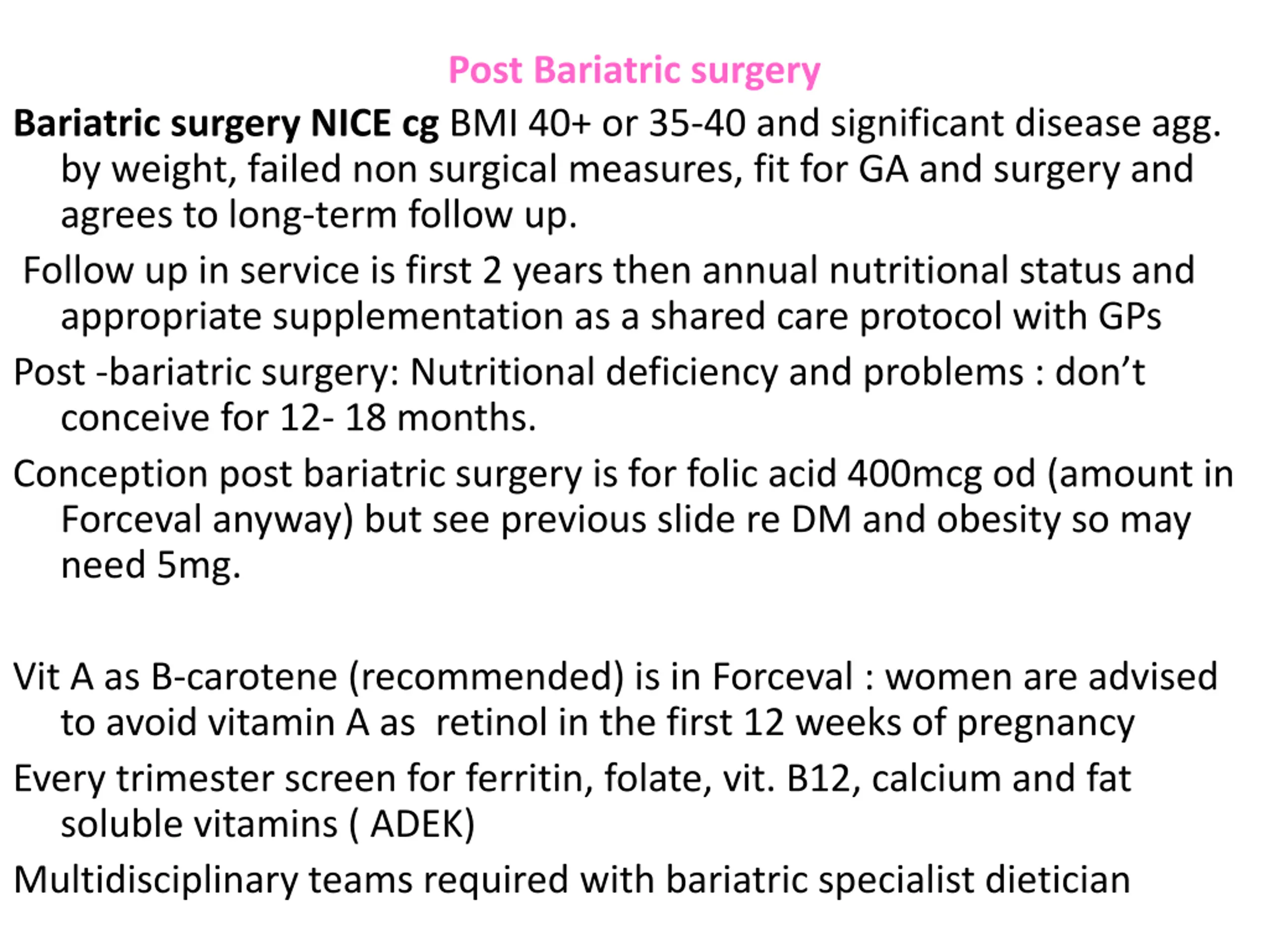Post Bariatric surgery Bariatric surgery NICE cg BMI 40+ or 35-40 and significant disease agg. by weight, failed non surgical measures, fit for GA and surgery and agrees to long-term follow up. Follow up in service is first 2 years then annual nutritional status and appropriate supplementation as a shared care protocol with GPs Post -bariatric surgery: Nutritional deficiency and problems : don t conceive for 12- 18 months. Conception post bariatric surgery is for folic acid 400mcg od (amount in Forceval anyway) but see previous slide re DM and obesity so may need 5mg. Vit A as B-carotene (recommended) is in Forceval : women are advised to avoid vitamin A as retinol in the first 12 weeks of pregnancy Every trimester screen for ferritin, folate, vit. B12, calcium and fat soluble vitamins ( ADEK) Multidisciplinary teams required with bariatric specialist dietician