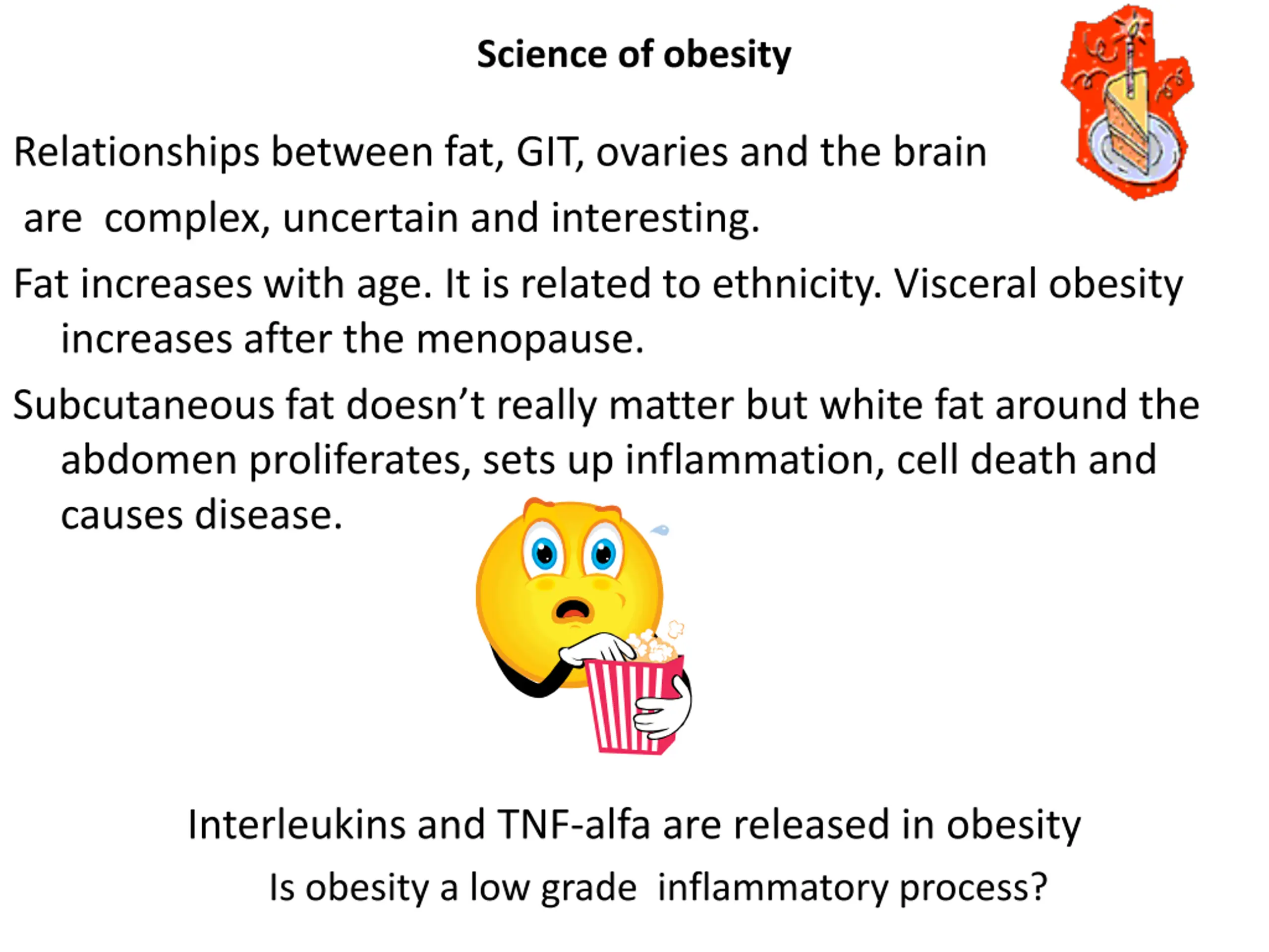 Science of obesity Relationships between fat, GIT, ovaries and the brain are complex, uncertain and interesting. Fat increases with age. It is related to ethnicity. Visceral obesity increases after the menopause. Subcutaneous fat doesn t really matter but white fat around the abdomen proliferates, sets up inflammation, cell death and causes disease. Interleukins and TNF-alfa are released in obesity Is obesity a low grade inflammatory process?
