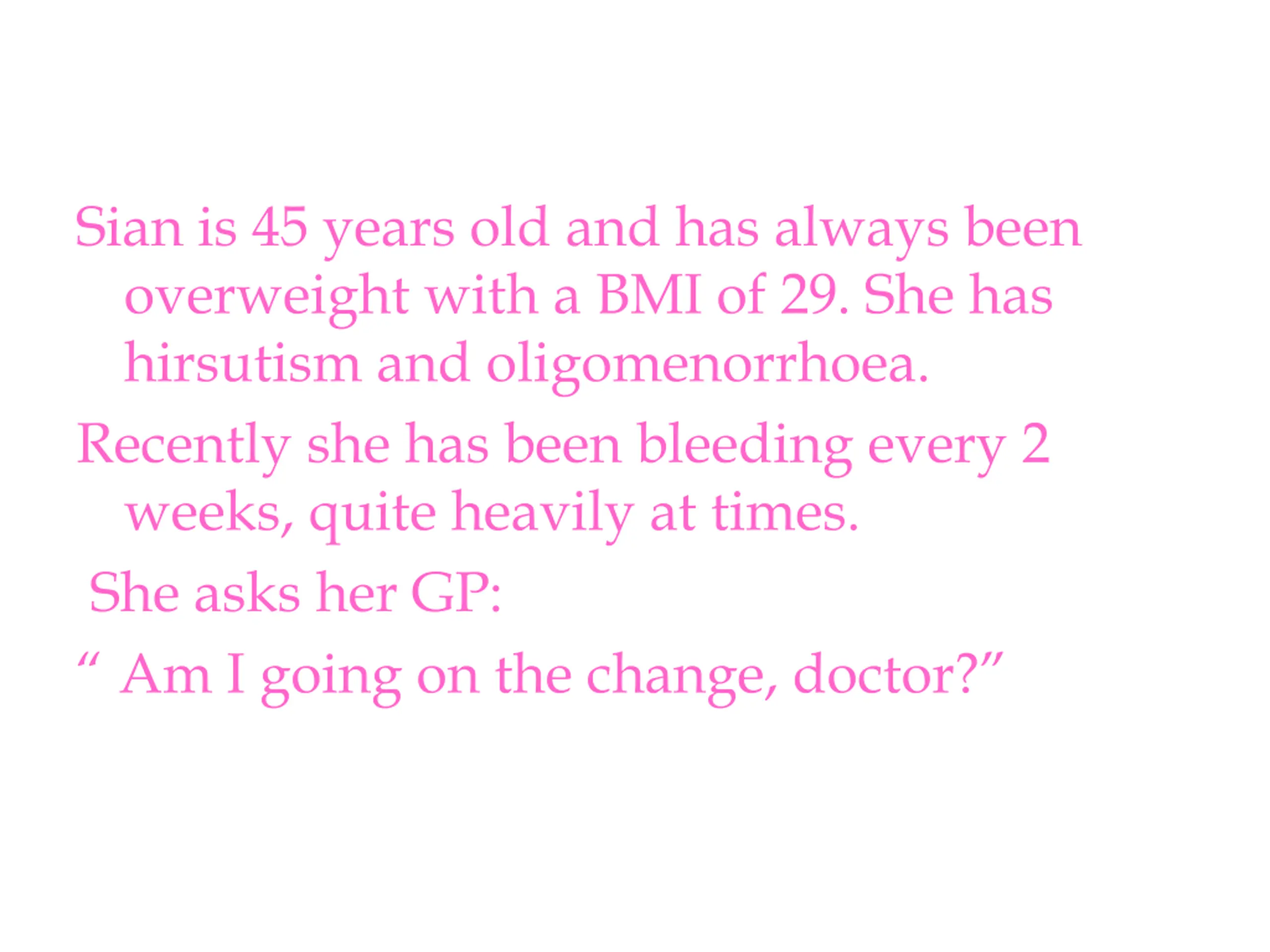 Sian is 45 years old and has always been overweight with a BMI of 29. She has hirsutism and oligomenorrhoea. Recently she has been bleeding every 2 weeks, quite heavily at times. She asks her GP: Am I going on the change, doctor?