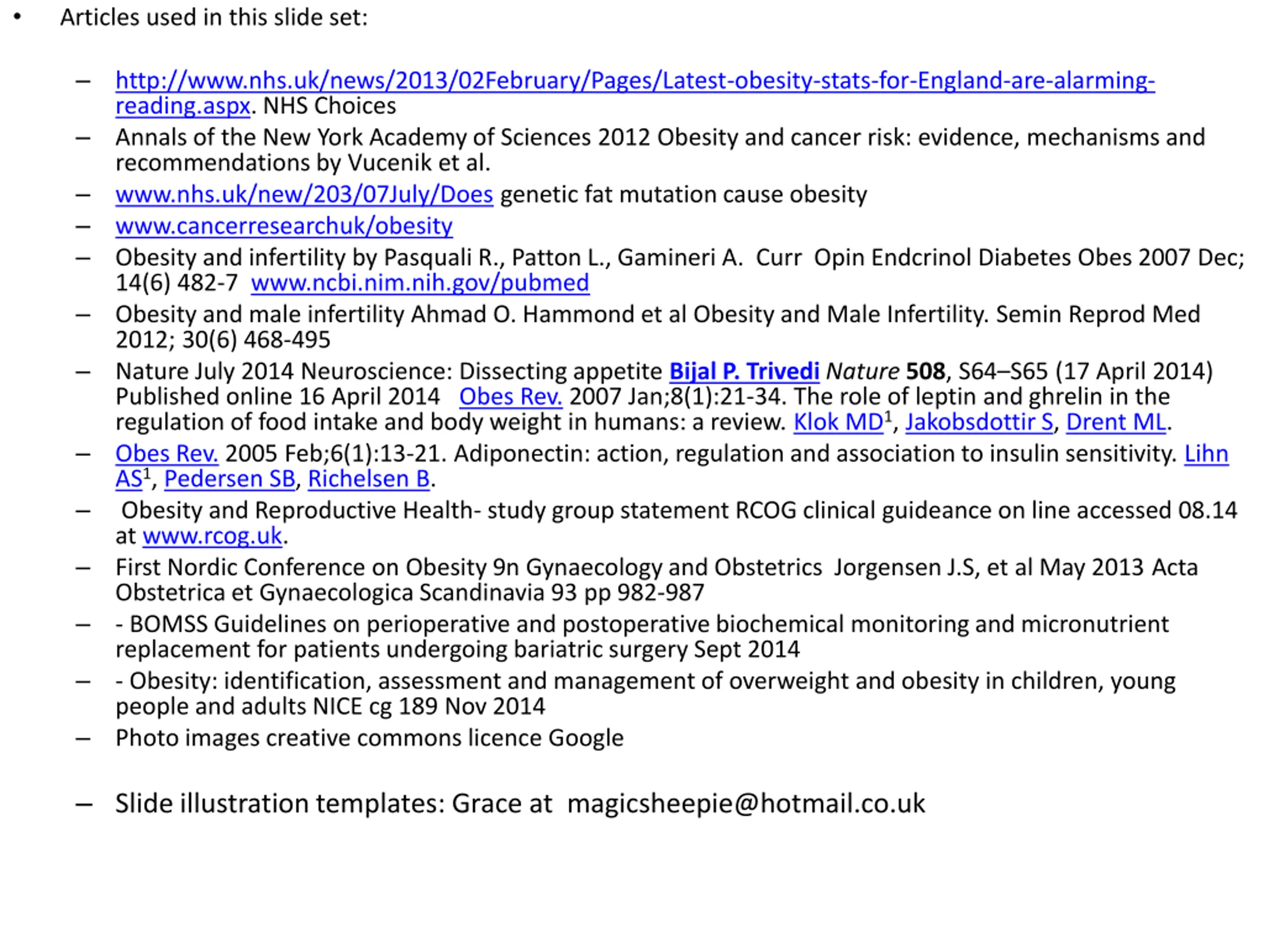 Articles used in this slide set: http://www.nhs.uk/news/2013/02February/Pages/Latest-obesity-stats-for-England-are-alarming- reading.aspx. NHS Choices Annals of the New York Academy of Sciences 2012 Obesity and cancer risk: evidence, mechanisms and recommendations by Vucenik et al. www.nhs.uk/new/203/07July/Does genetic fat mutation cause obesity www.cancerresearchuk/obesity Obesity and infertility by Pasquali R., Patton L., Gamineri A. Curr Opin Endcrinol Diabetes Obes 2007 Dec; 14(6) 482-7 www.ncbi.nim.nih.gov/pubmed Obesity and male infertility Ahmad O. Hammond et al Obesity and Male Infertility. Semin Reprod Med 2012; 30(6) 468-495 Nature July 2014 Neuroscience: Dissecting appetite Bijal P. Trivedi Nature 508, S64 S65 (17 April 2014) Published online 16 April 2014 Obes Rev. 2007 Jan;8(1):21-34. The role of leptin and ghrelin in the regulation of food intake and body weight in humans: a review. Klok MD1, Jakobsdottir S, Drent ML. Obes Rev. 2005 Feb;6(1):13-21. Adiponectin: action, regulation and association to insulin sensitivity. Lihn AS1, Pedersen SB, Richelsen B. Obesity and Reproductive Health- study group statement RCOG clinical guideance on line accessed 08.14 at www.rcog.uk. First Nordic Conference on Obesity 9n Gynaecology and Obstetrics Jorgensen J.S, et al May 2013 Acta Obstetrica et Gynaecologica Scandinavia 93 pp 982-987 - BOMSS Guidelines on perioperative and postoperative biochemical monitoring and micronutrient replacement for patients undergoing bariatric surgery Sept 2014 - Obesity: identification, assessment and management of overweight and obesity in children, young people and adults NICE cg 189 Nov 2014 Photo images creative commons licence Google Slide illustration templates: Grace at magicsheepie@hotmail.co.uk