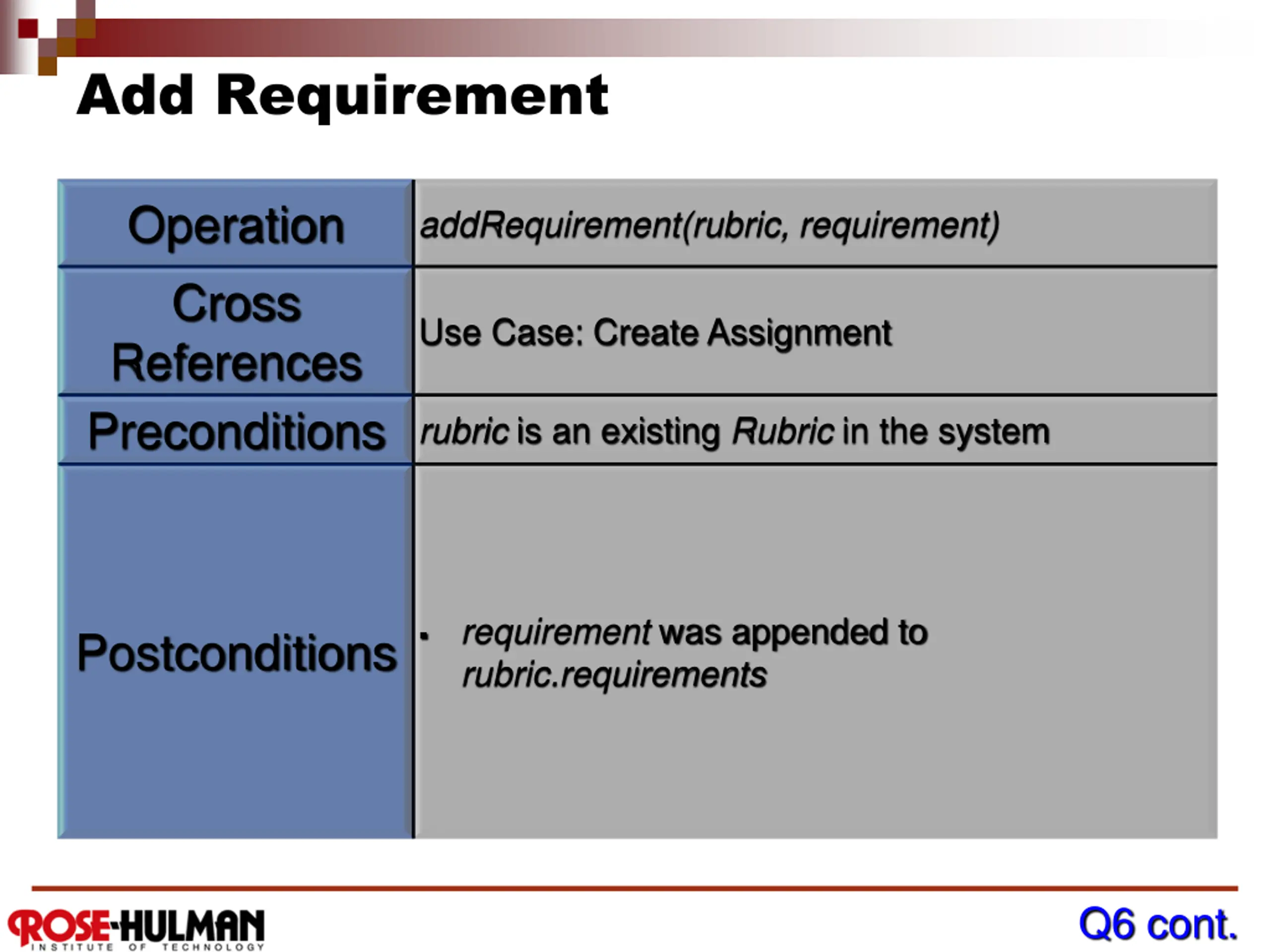 Add Requirement Operation Cross References Preconditions addRequirement(rubric, requirement) Use Case: Create Assignment rubric is an existing Rubric in the system requirement was appended to rubric.requirements Postconditions Q6 cont.