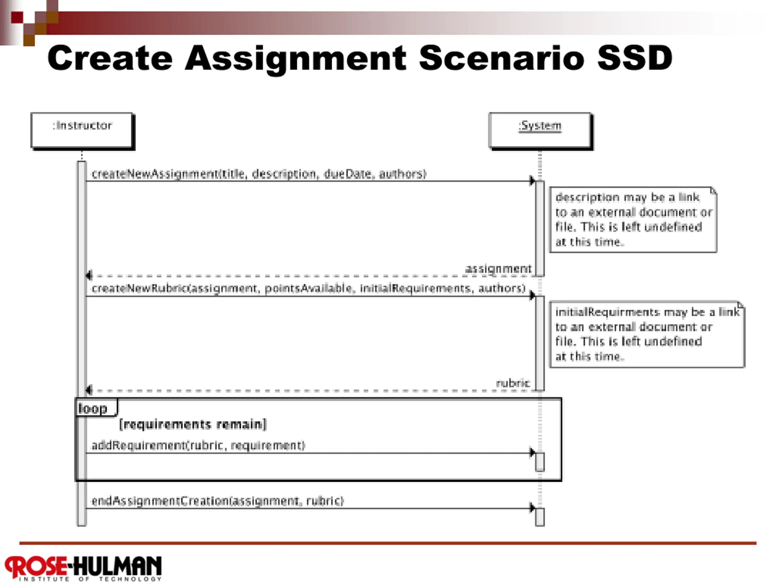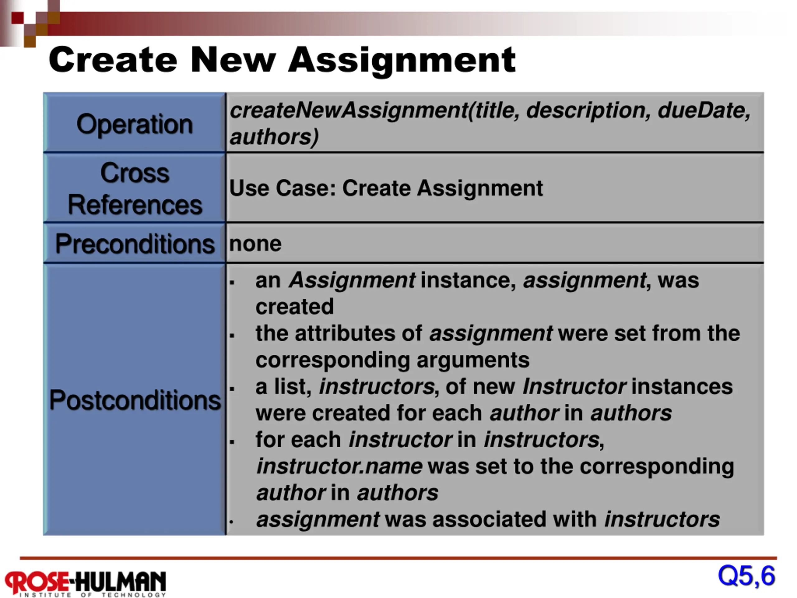 Create New Assignment createNewAssignment(title, description, dueDate, authors) Operation Cross References Preconditions none Use Case: Create Assignment an Assignment instance, assignment, was created the attributes of assignment were set from the corresponding arguments a list, instructors, of new Instructor instances were created for each author in authors for each instructor in instructors, instructor.name was set to the corresponding author in authors assignment was associated with instructors Postconditions Q5,6