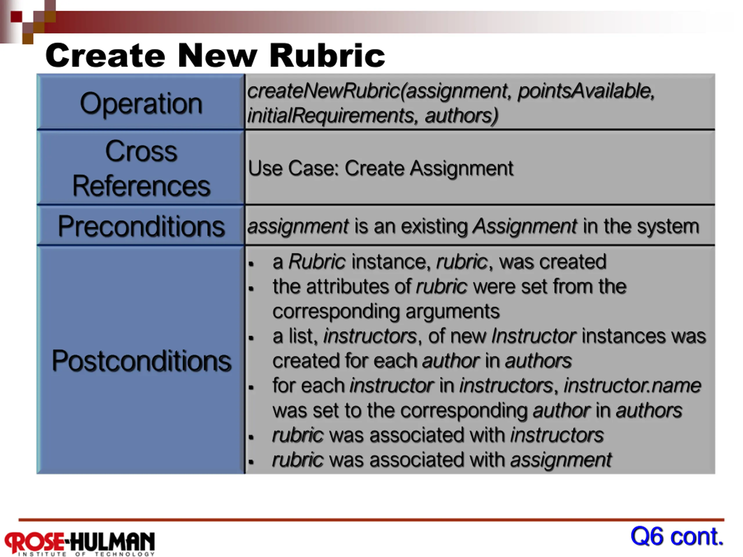 Create New Rubric Operation Cross References Preconditions createNewRubric(assignment, pointsAvailable, initialRequirements, authors) Use Case: Create Assignment assignment is an existing Assignment in the system a Rubric instance, rubric, was created the attributes of rubric were set from the corresponding arguments a list, instructors, of new Instructor instances was created for each author in authors for each instructor in instructors, instructor.name was set to the corresponding author in authors rubric was associated with instructors rubric was associated with assignment Postconditions Q6 cont.