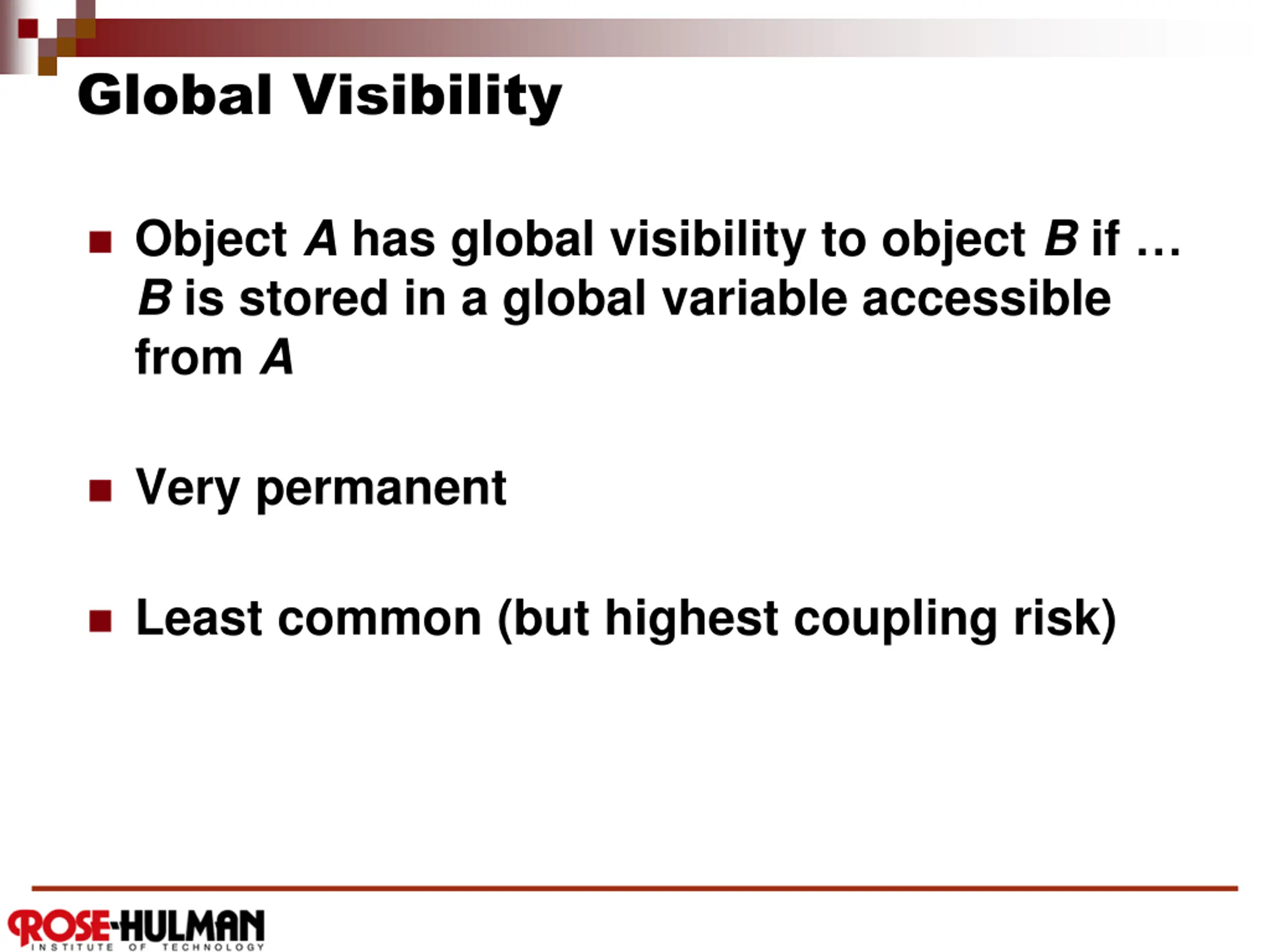 Global Visibility Object A has global visibility to object B if B is stored in a global variable accessible from A Very permanent Least common (but highest coupling risk)