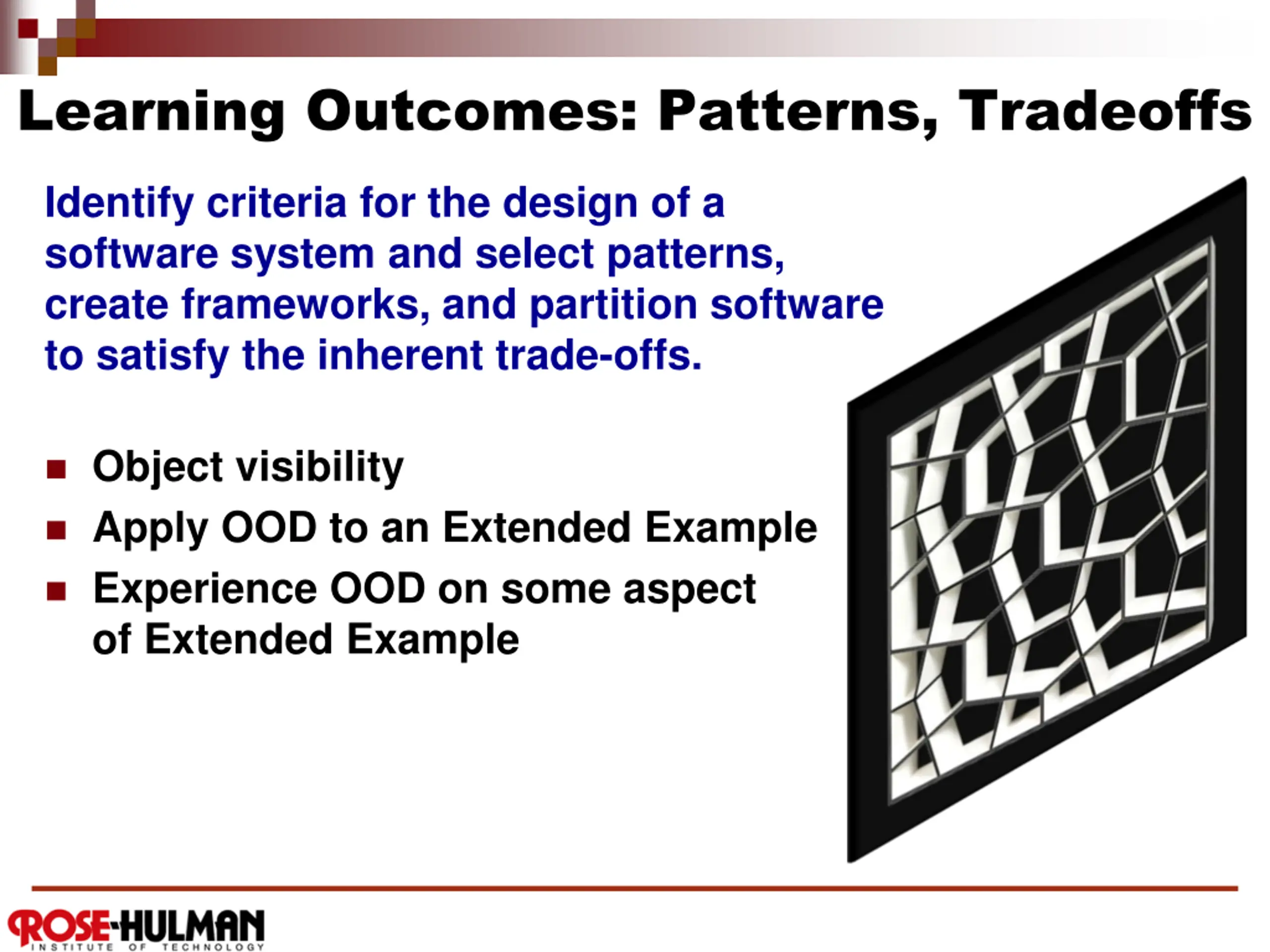 Learning Outcomes: Patterns, Tradeoffs Identify criteria for the design of a software system and select patterns, create frameworks, and partition software to satisfy the inherent trade-offs. Object visibility Apply OOD to an Extended Example Experience OOD on some aspect of Extended Example