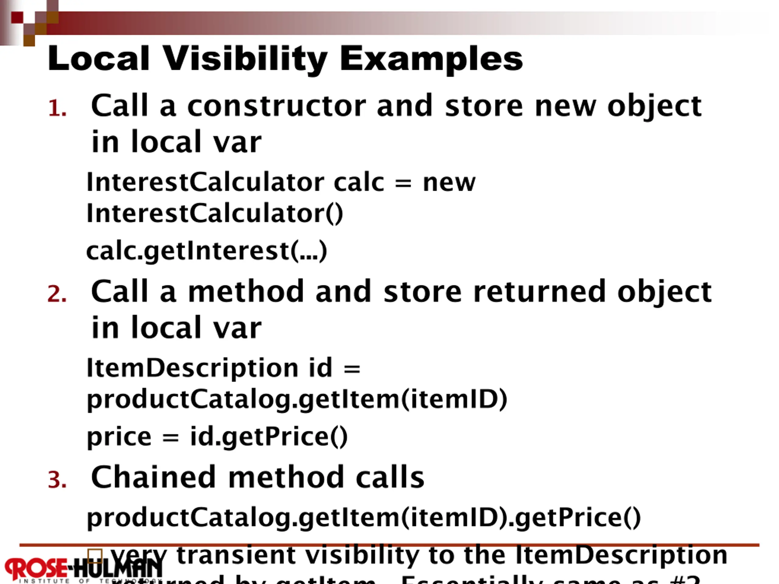 Local Visibility Examples 1. Call a constructor and store new object in local var InterestCalculator calc = new InterestCalculator() calc.getInterest(...) 2. Call a method and store returned object in local var ItemDescription id = productCatalog.getItem(itemID) price = id.getPrice() 3. Chained method calls productCatalog.getItem(itemID).getPrice() very transient visibility to the ItemDescription returned by getItem. Essentially same as #2.