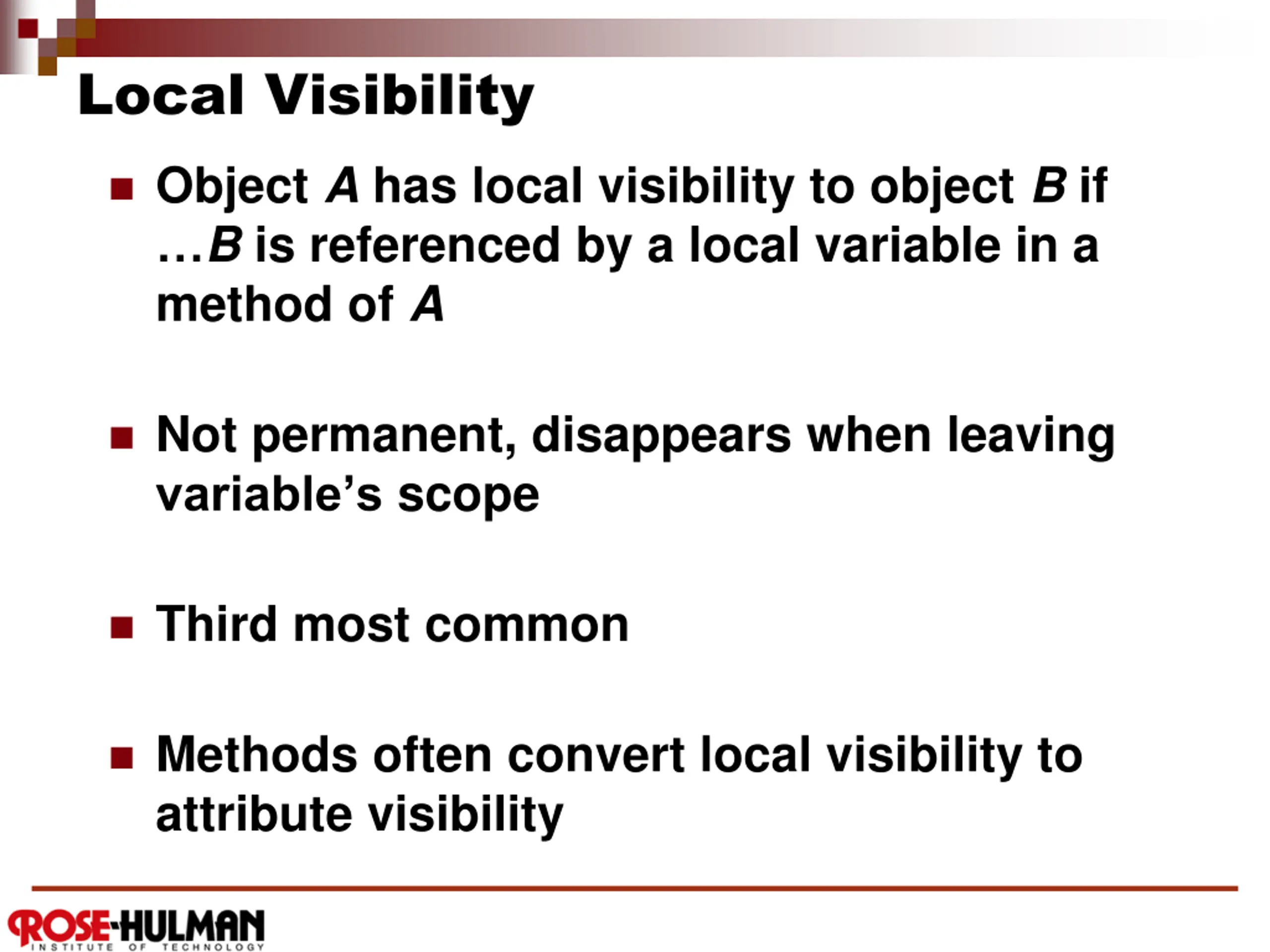 Local Visibility Object A has local visibility to object B if B is referenced by a local variable in a method of A Not permanent, disappears when leaving variable s scope Third most common Methods often convert local visibility to attribute visibility