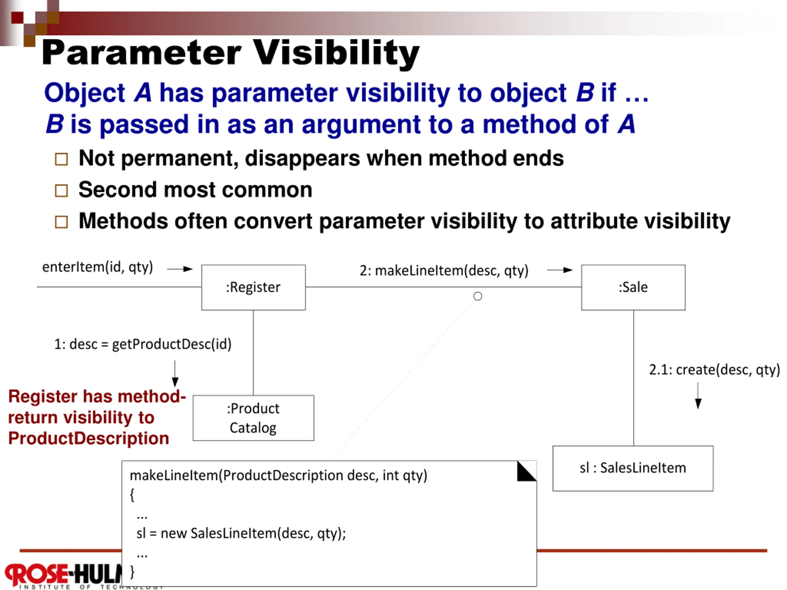 Attribute Visibility Object A has attribute visibility to object Bif A has an attribute that stores B class Register { ... private ProductCatalog catalog; ... } Quite permanent Most common : Register : ProductCatalog enterItem (itemID, quantity) desc = getProductDesc( itemID ) public void enterItem( itemID, qty ) { ... desc = catalog.getProductDesc(itemID) ... }